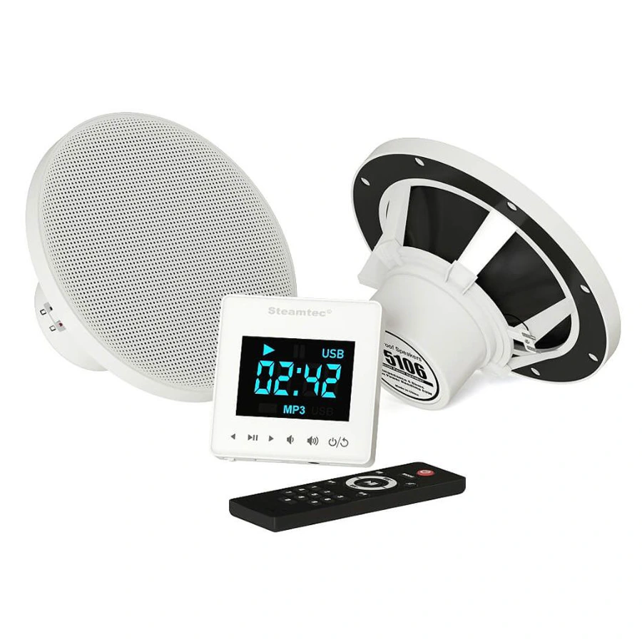 Комплект акустической системы SteamTec TOLO Music system позволяет прослушивать музыку там, где это достаточно проблематично: в сауне, хамам, душевой и ванной комнате. Многие посетители парных уже давно заметили, что любимые мелодии способствуют более быстрому расслаблению и релаксации. Благодаря защите уровня IР68 оборудование может работать даже в суровом микроклимате парной с его высокой температурой и влажностью. В комплект идут две колонки, обладающие влагостойкостью и достаточно неплохим звучанием.