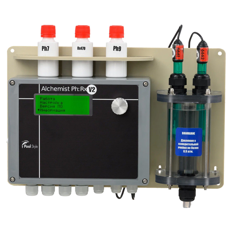 PoolStyle Alchemist Ph Rx – пульт автоматического управления дозированием химических реагентов «РН-» и «CL» (с четырёхстрочным информационным дисплеем и энкодером). Дозация хим. реагента Cl происходит по показаниям электрода RX.
