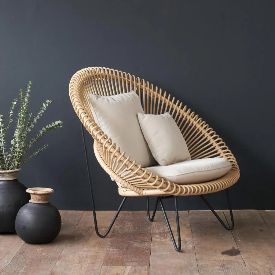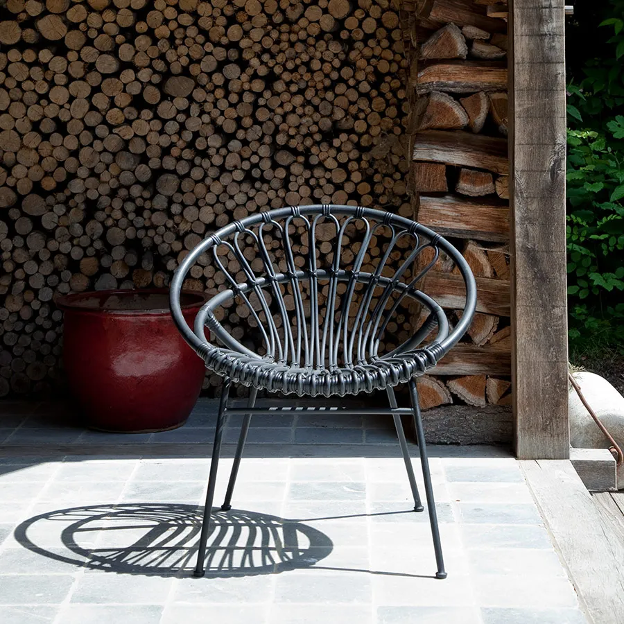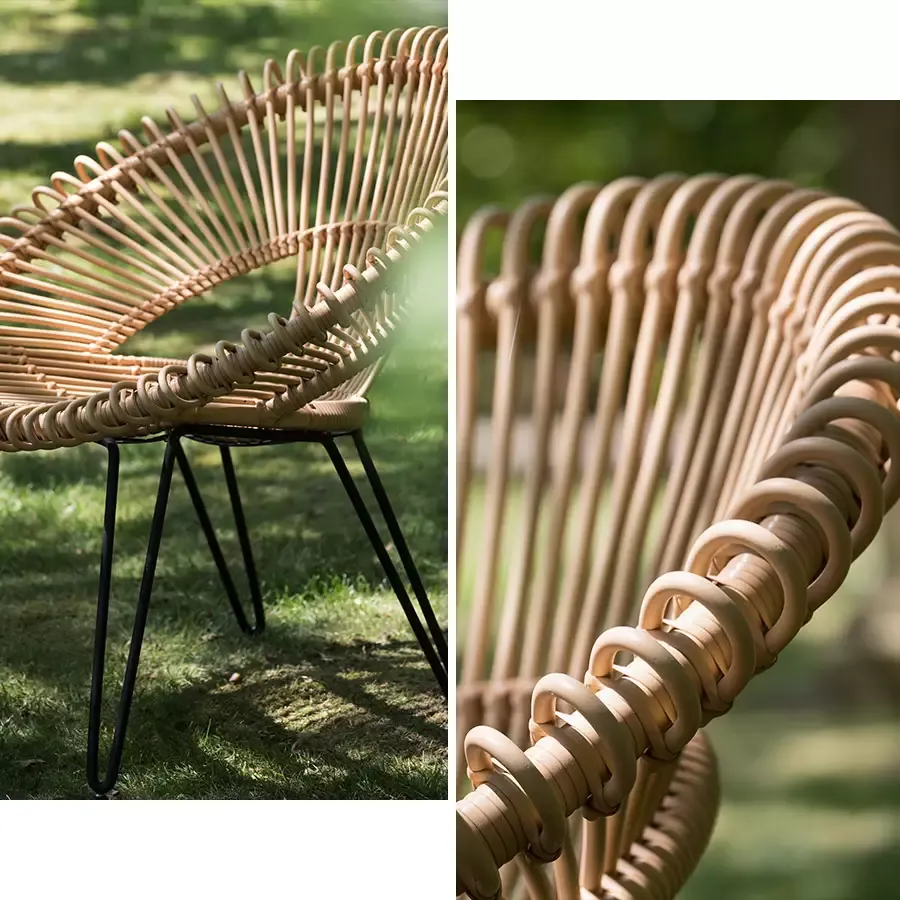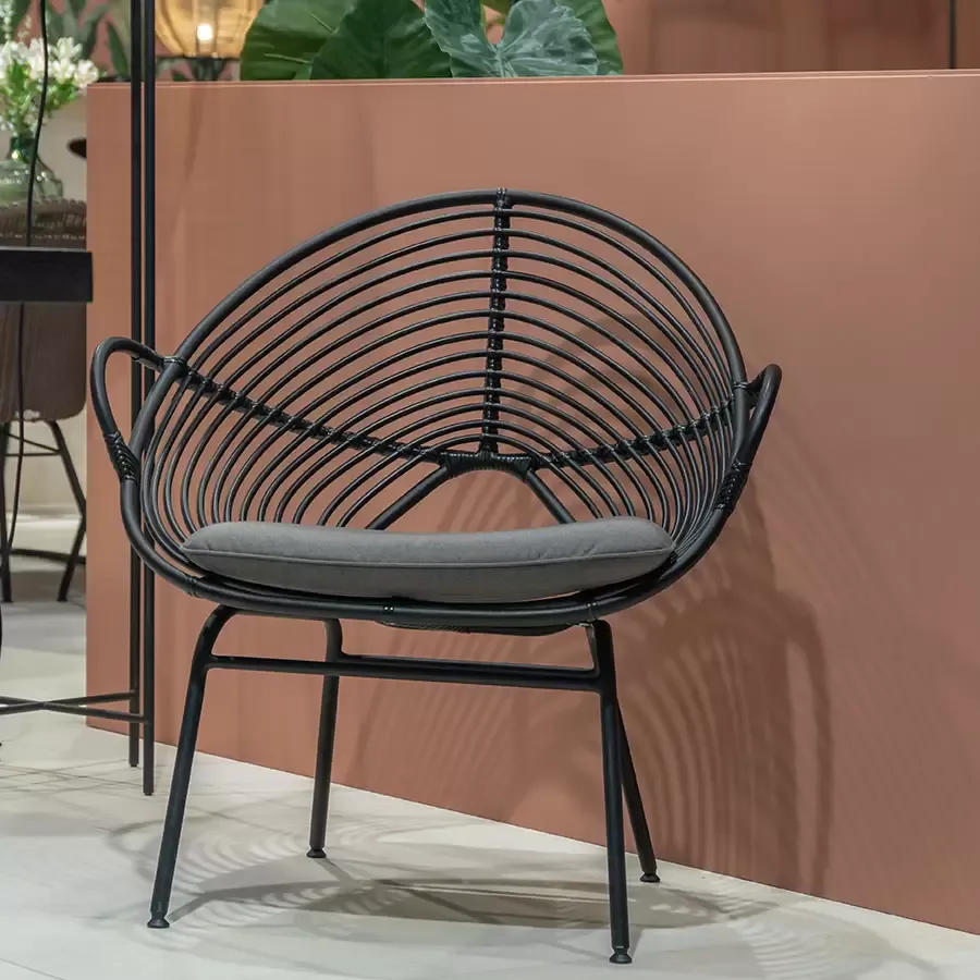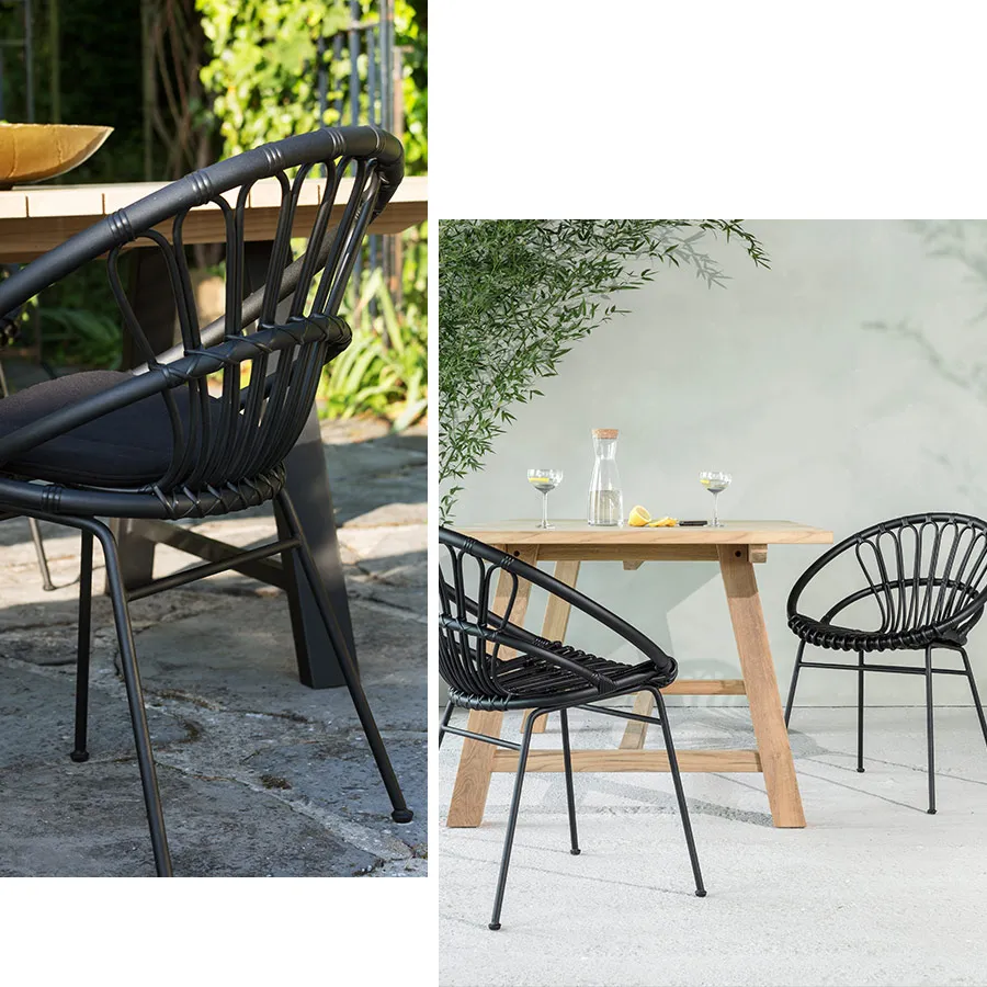 Плетение с эффектом ротанга из полиэтиленовой веревки доступно в двух цветах: черный и Camel (верблюжий). Алюминиевая рама, основание – оцинкованная сталь с черным порошковым покрытием. Подушки со съемными чехлами, широкий ассортимент текстиля.