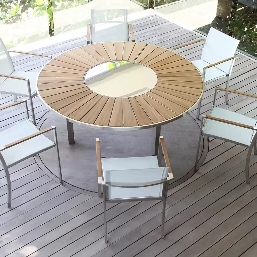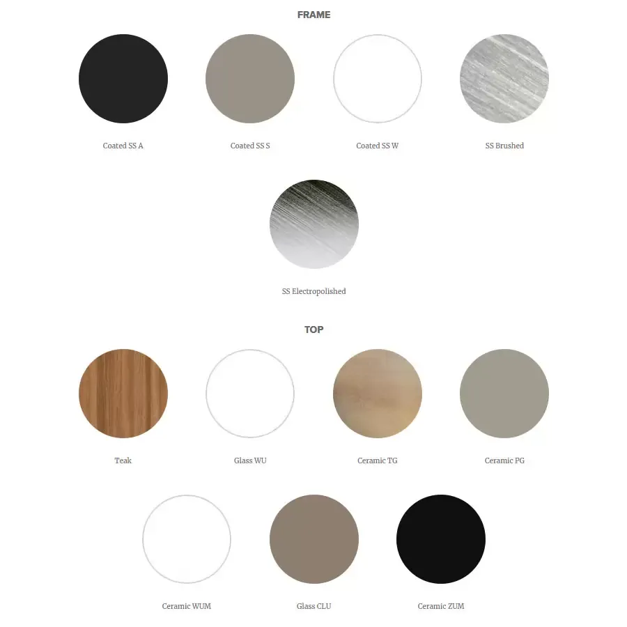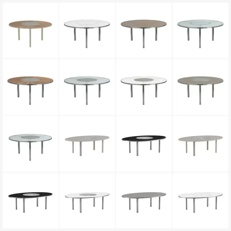Круглые столы способствуют общению: два, три, четыре или более человек могут сидеть за круглой столешницей, и никто не чувствует себя застрявшим в углу. Теперь в коллекции появились столы овальной формы. Основание из нержавейки. Столешница может быть выполнена из тикового дерева, стекла или керамики. Также есть модели с центром из нержавеющей стали.