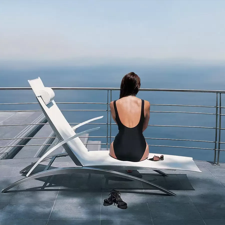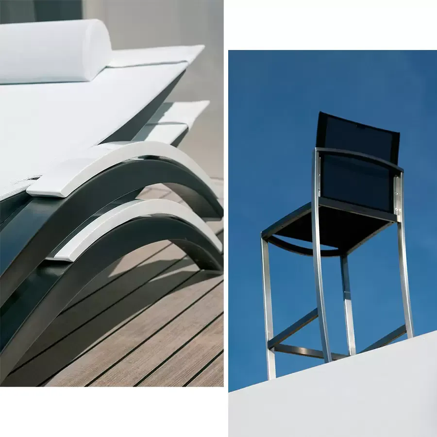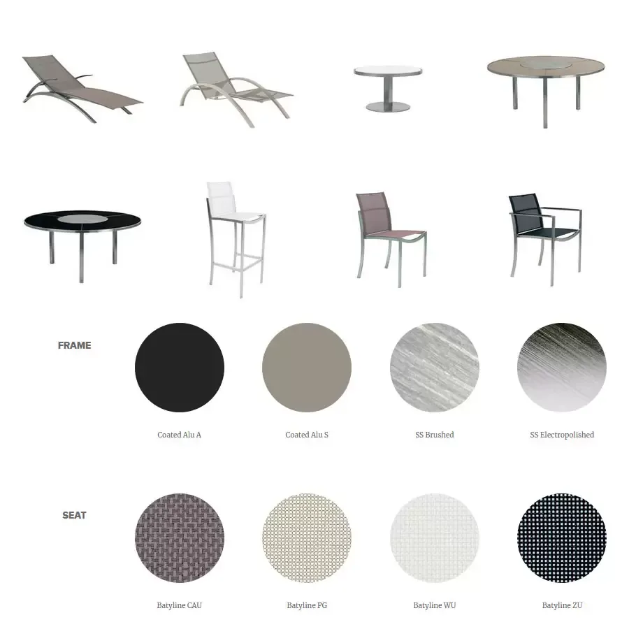 Штабелируемые садовые стулья и кресла имеют легкий и элегантный дизайн. Каркас из алюминия или нержавеющей стали: полированной, брашированной или окрашенной. Сиденья из батилина (Batyline).