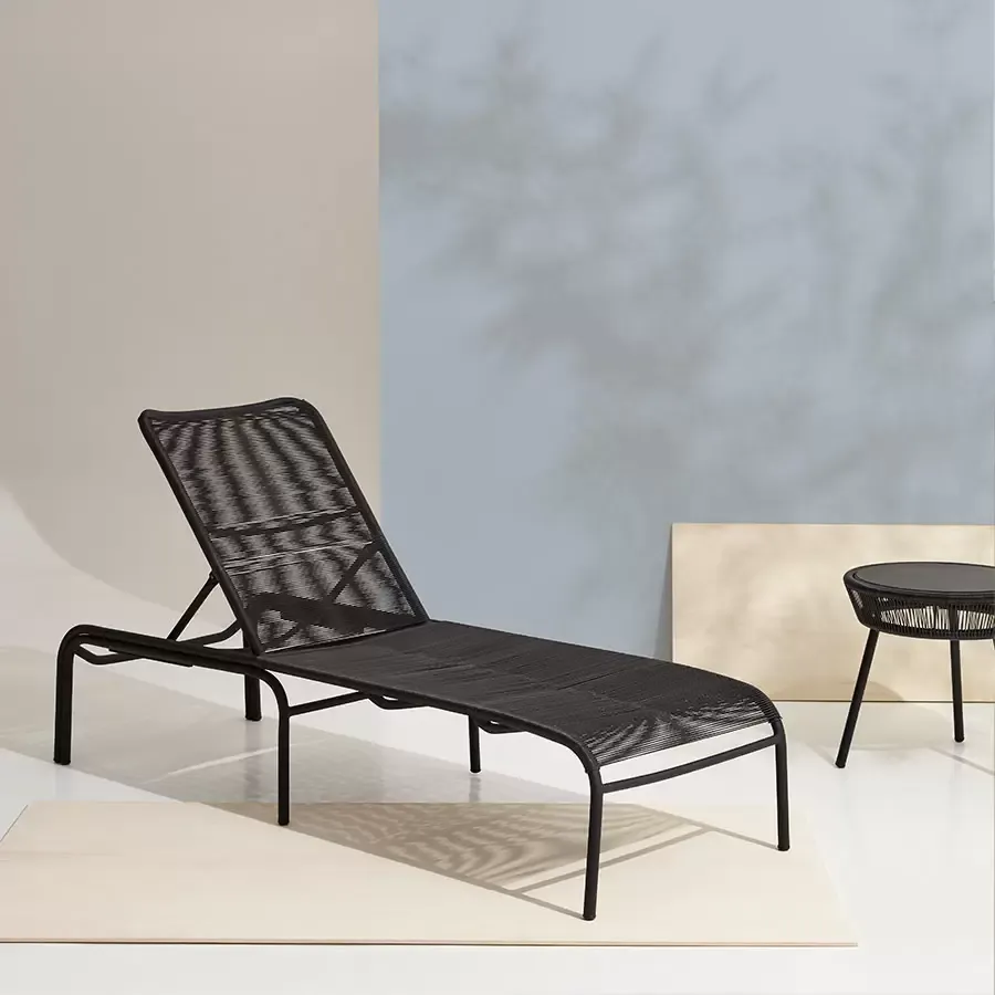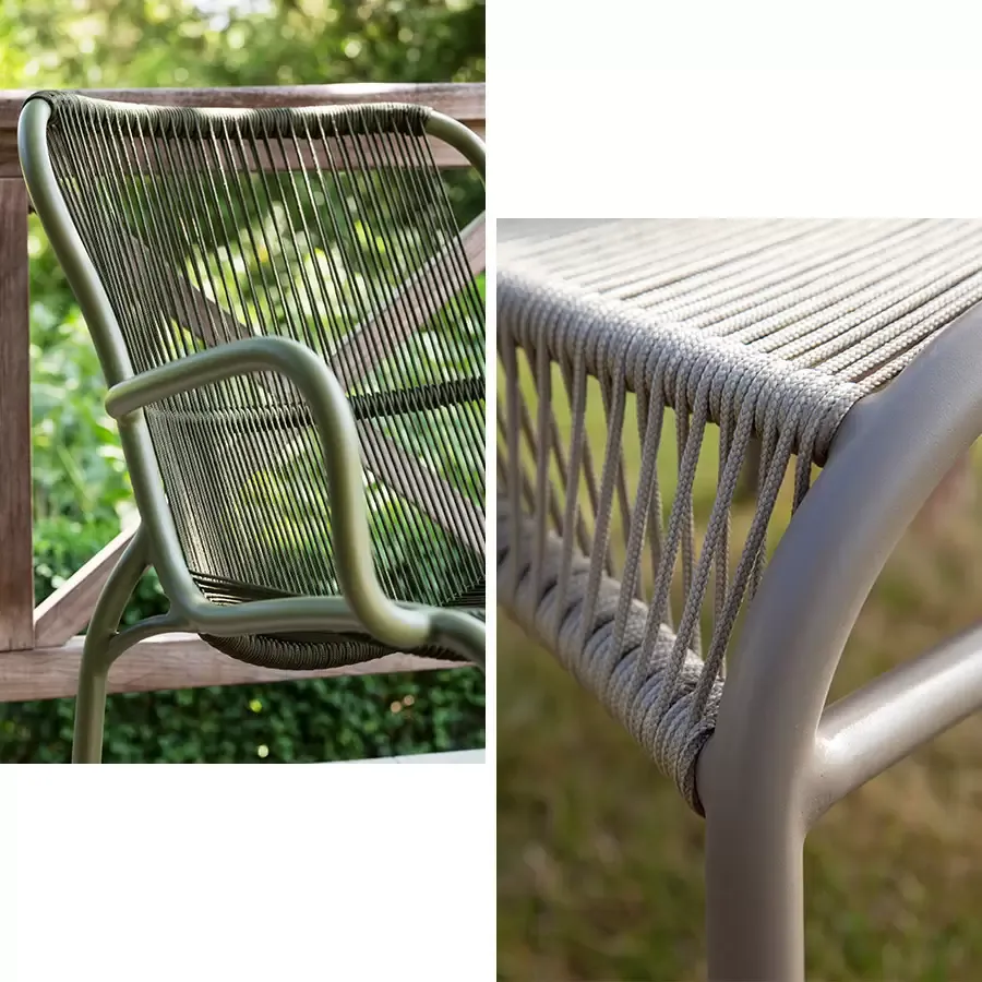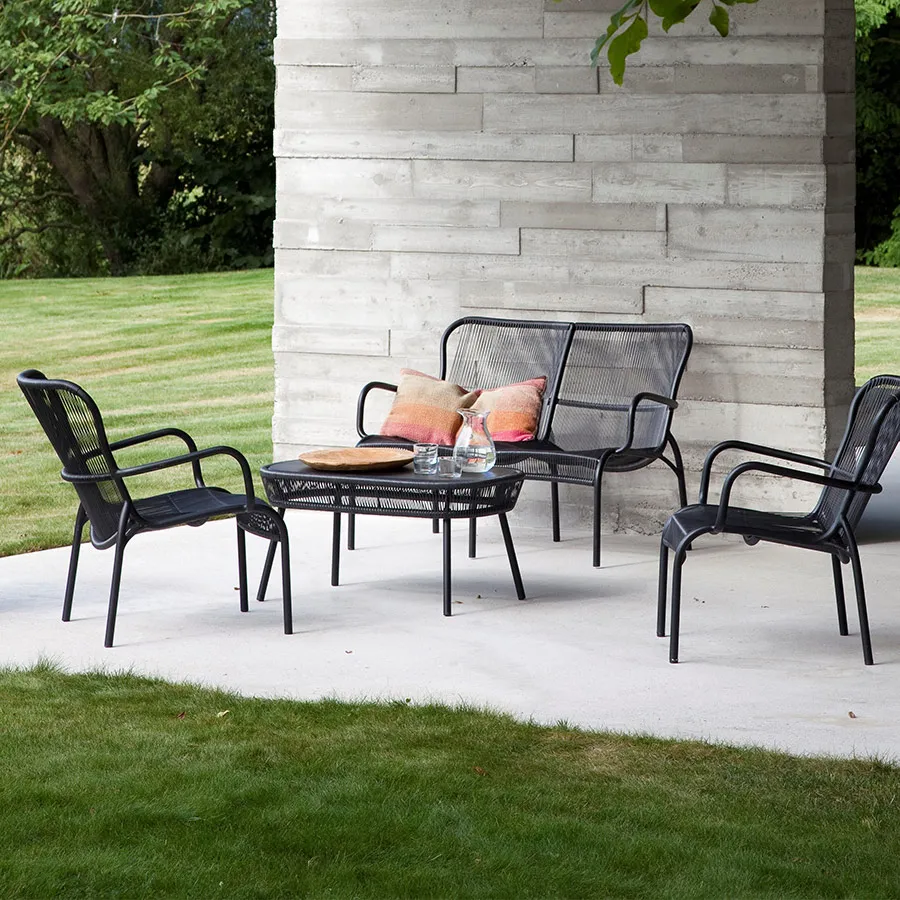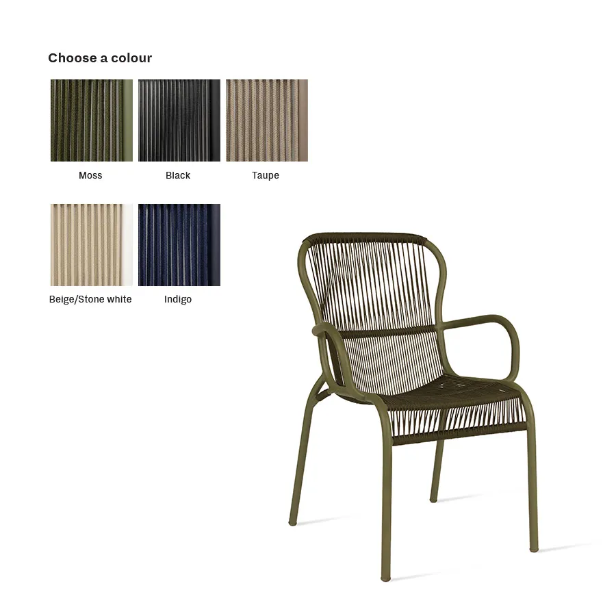 Мебель для улицы Loop доступна в черном, коричневом, бежевом / каменно-белом, цвете мха (зеленый) и индиго (ограниченный выпуск). Материалы: алюминиевая рама с порошковым покрытием, полиэтиленовое волокно (чёрное) или полипропиленовая веревка (остальные цвета).