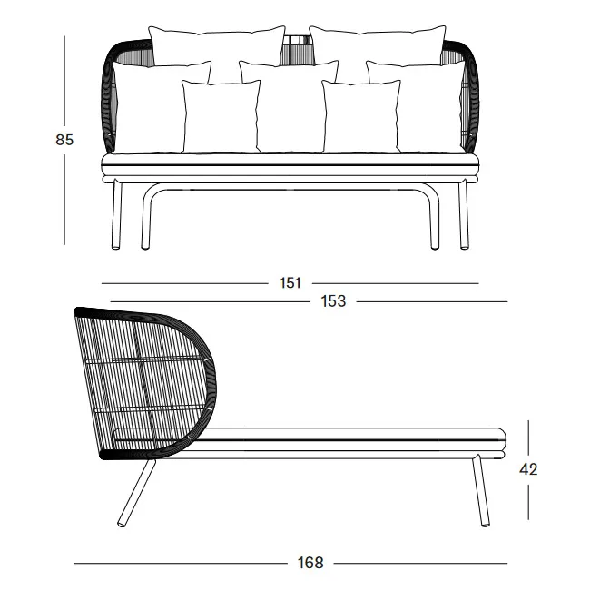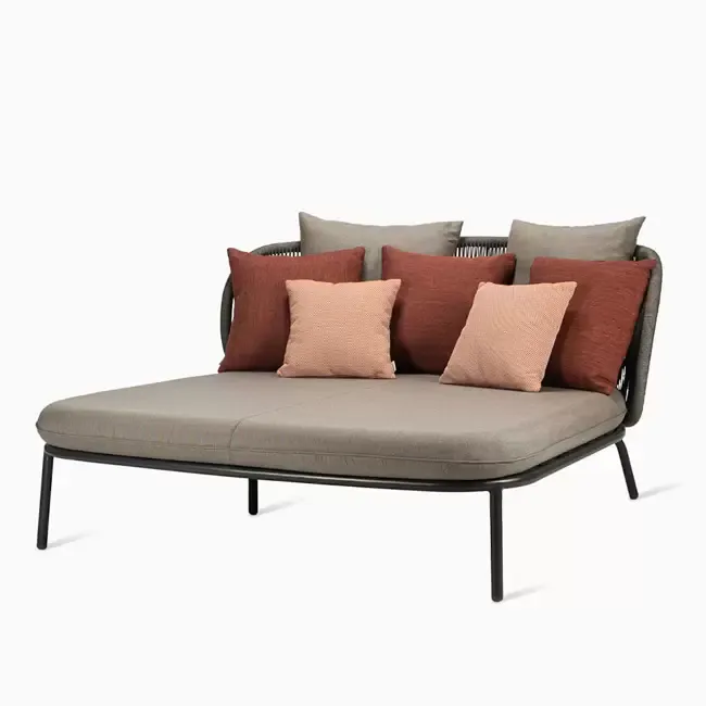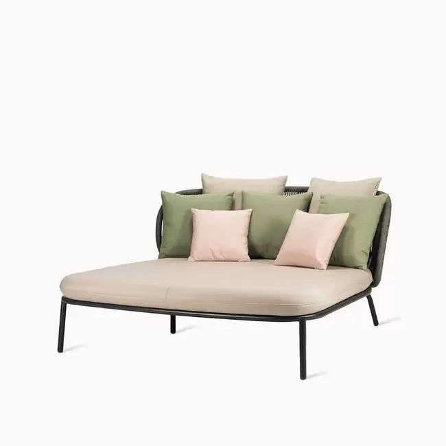 Кушетка Kodo: алюминиевая рама с порошковым покрытием, плетение из акриловой веревки, съемные чехлы и большой выбор текстиля для подушек.
