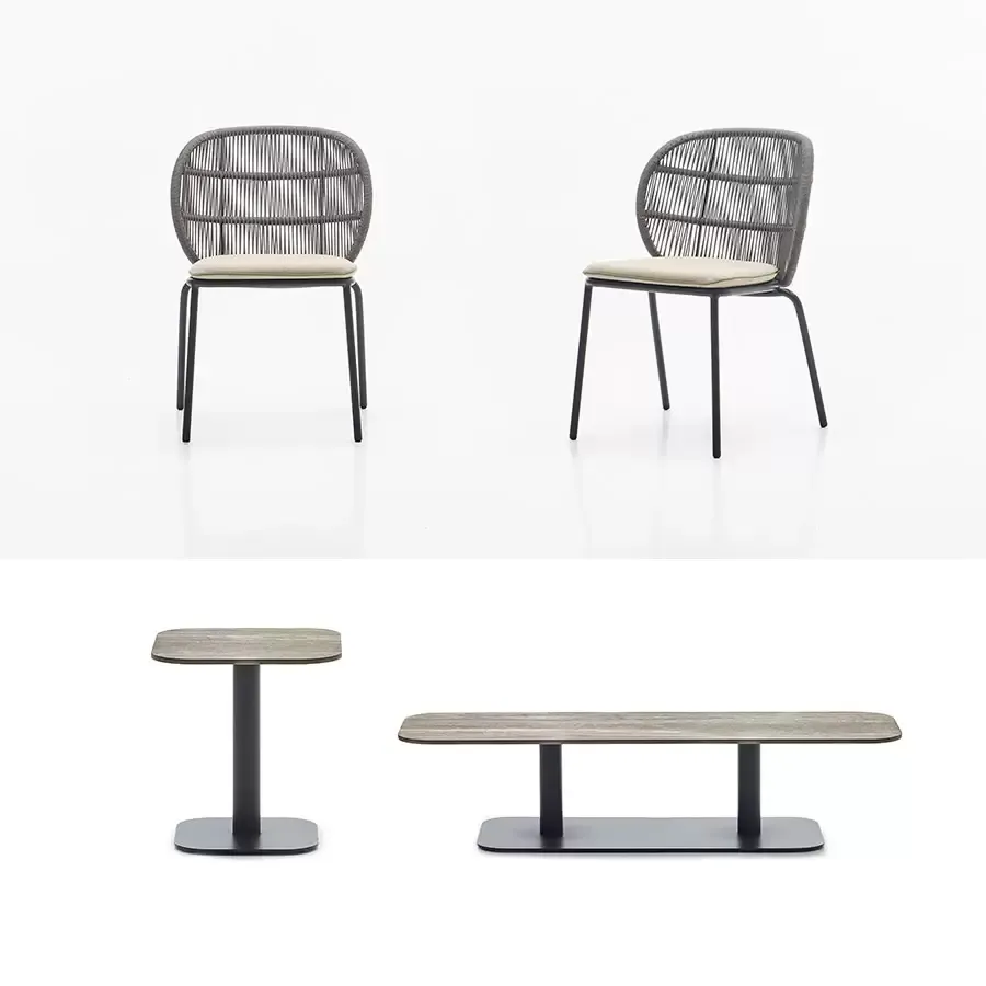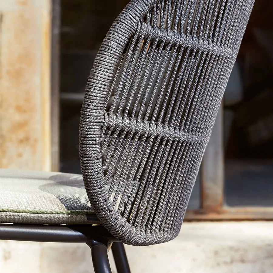 Сиденья Kodo: алюминиевая рама с порошковым покрытием, плетение из акриловой веревки, съемные чехлы и большой выбор текстиля для подушек.