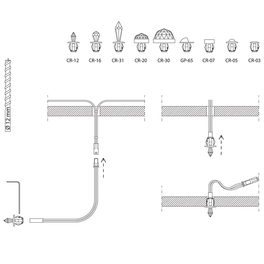 Набор включает насадки с хрусталем Swarovski Strass в цветах хрома или золота. Эти хрустальные насадки можно подключить к любому светодиодному комплекту Cariitti.