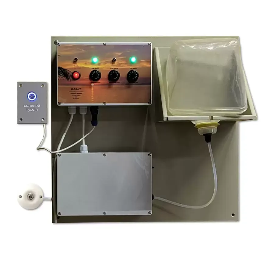 Генератор морского климата R-Salt-II – установка, создающая соляной туман в паровых и соляных кабинах. R-Salt имеет простой дизайн, неприхотлив в использовании. Генератор морского климата R-Salt может быть установлен в парных или солевых комнатах как дополнительная или отдельная процедура. Оборудование полностью готовое к монтажу. В комплект поставки входит 1 канистра солевого раствора 5л + 1 таблетка дезинфекции, выносная панелью включения с пьезокнопкой и индикацией состояния.