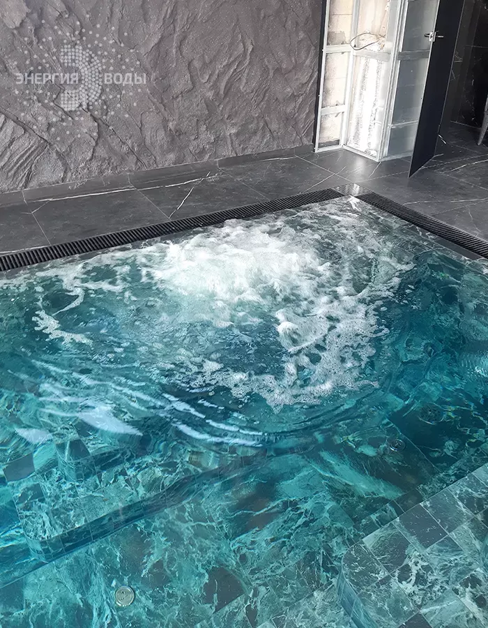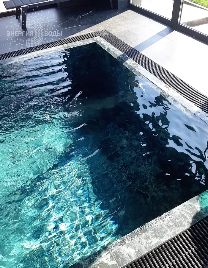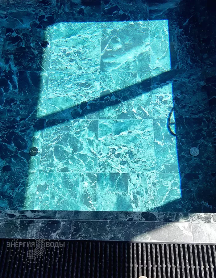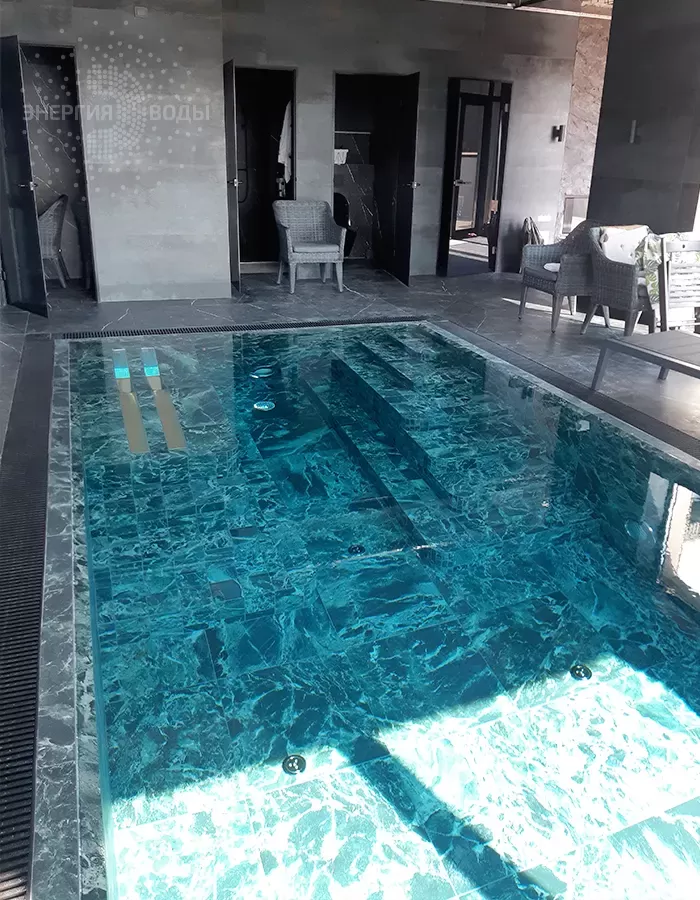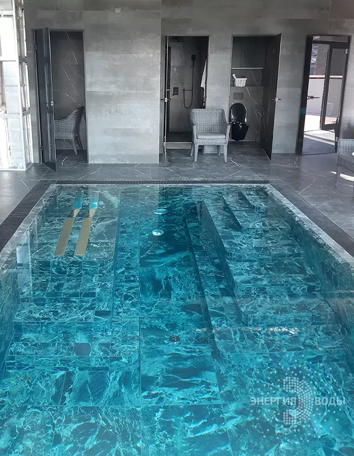Строительство и отделка бассейна в Минском районе. Размер чаши 3×6 м. В бассейне установлена система фильтрации воды и противоток, который может использоваться как для тренировок, так и для развлечения. А встроенный лежак с аэровоздушными форсунками подарит максимальное расслабление от гидромассажа.