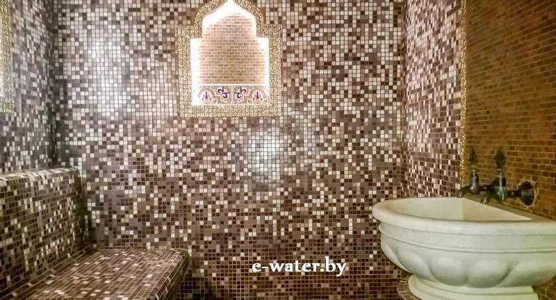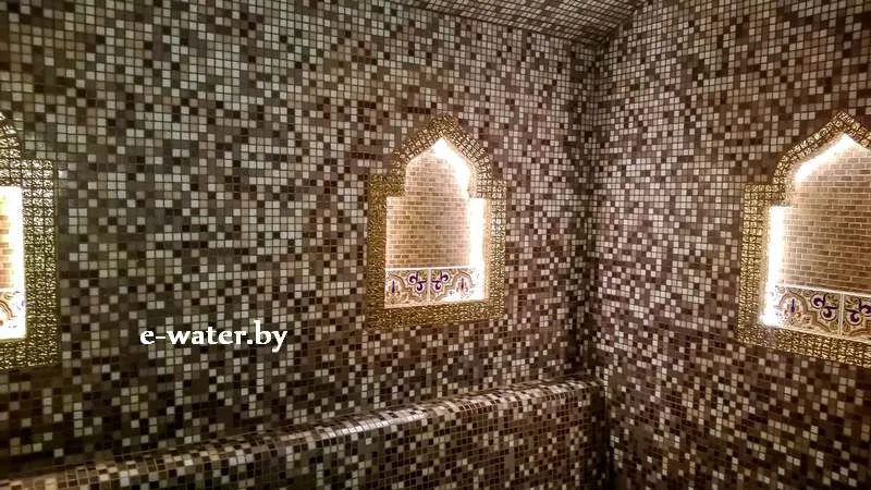 Строительство хаммама возле Нарочи под ключ. Арки с подсветкой, сантехника в османском стиле, мраморная курна – сказочная атмосфера этой турецкой бани помогает расслабится и дарит посетителям эстетическое удовольствие. В комплексе с парной построен бассейн, установлен душ впечатлений.
