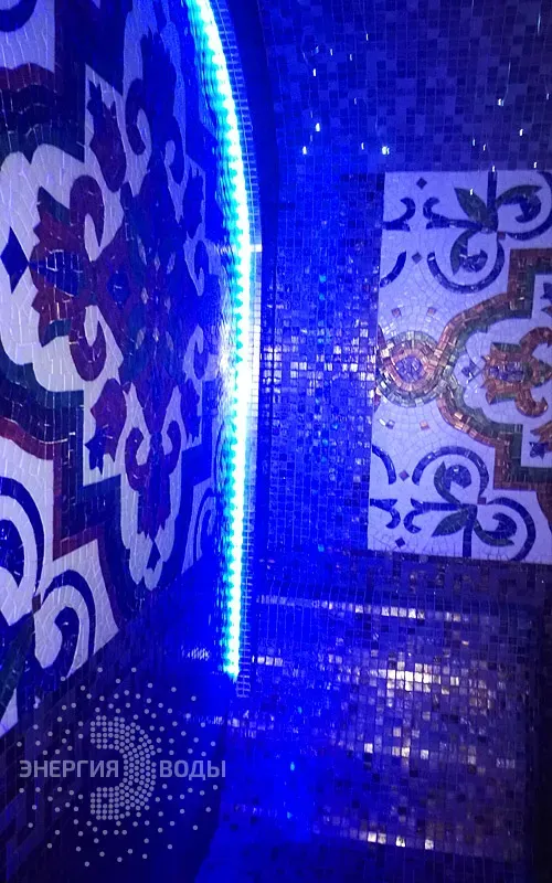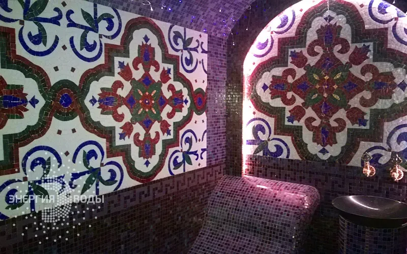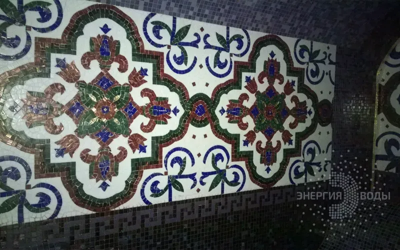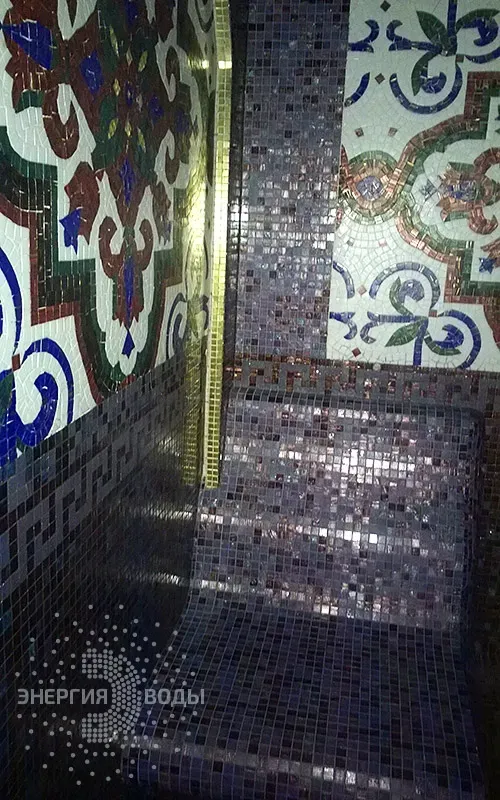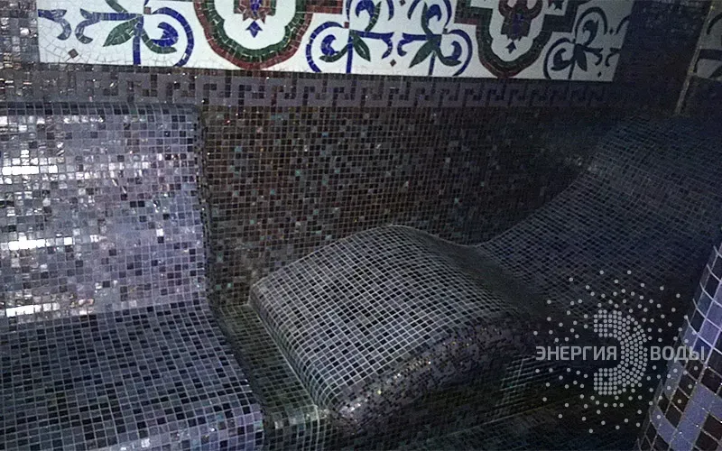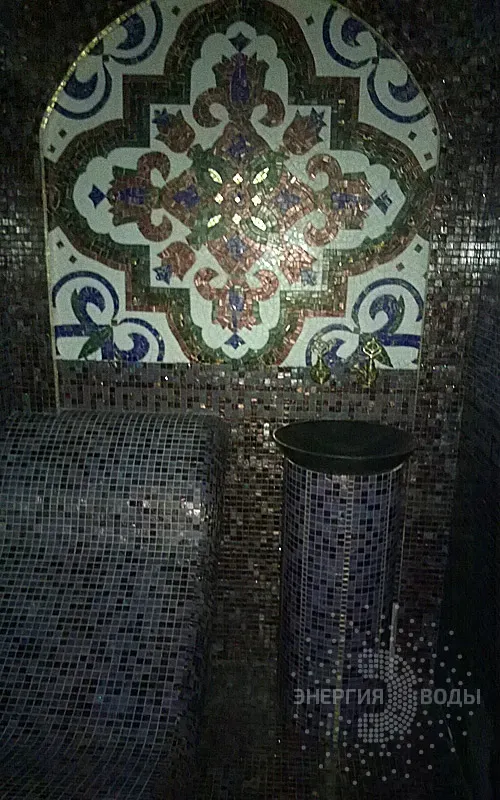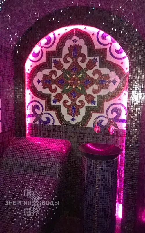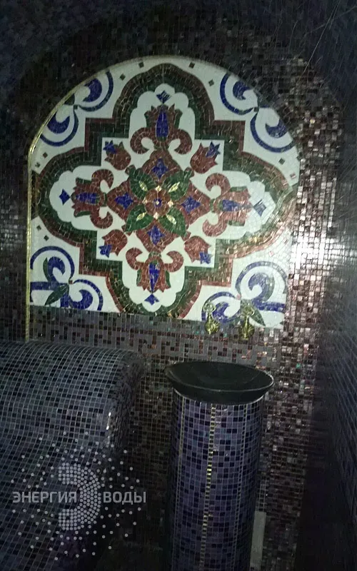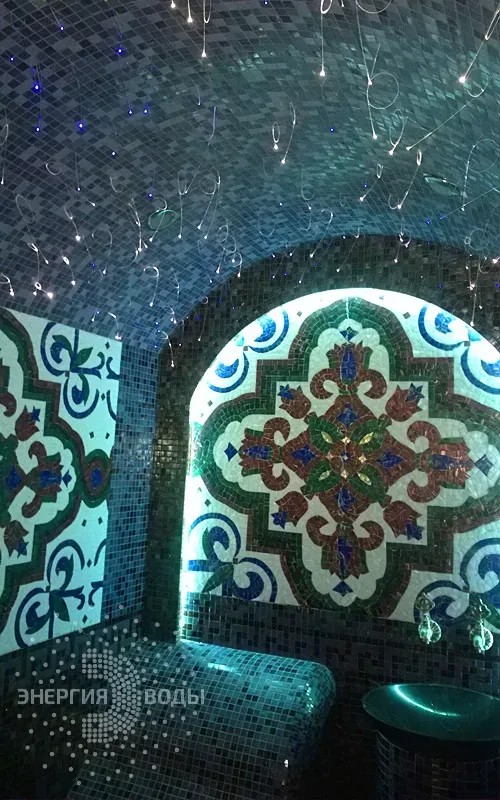 Строительство турецкой бани в Фаниполе под ключ. На стенах из мозаики выложены панно с орнаментом. Анатомический лежак и сиденья с подогревом. Освещение в хаммаме – линейная RGB подсветка и имитация звездного неба.