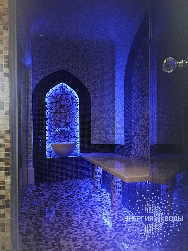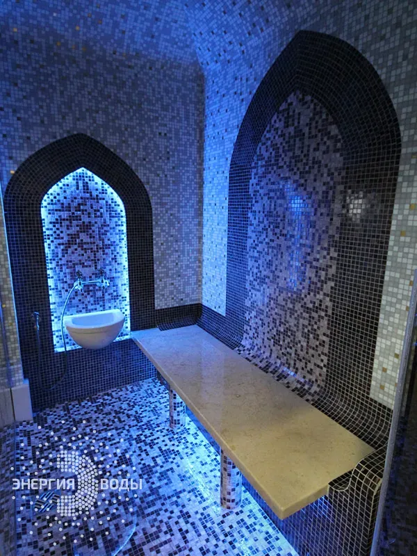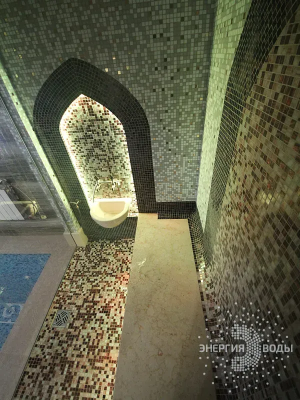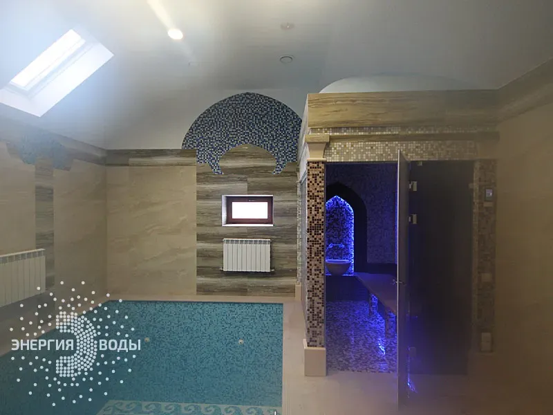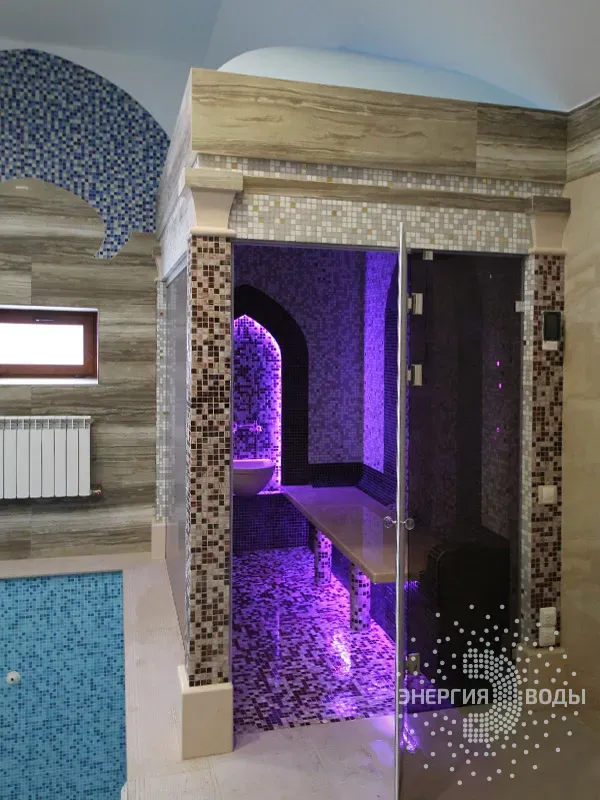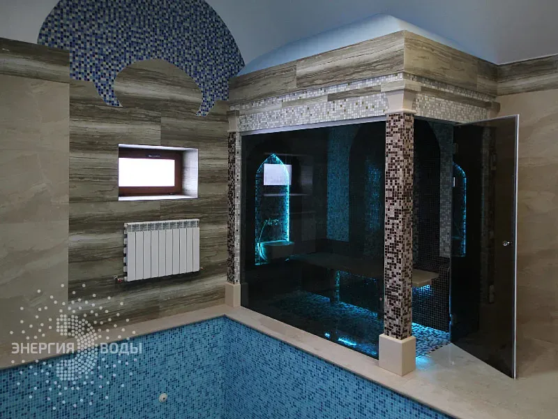 Строительство турецкой бани в Силичах под ключ. Компактный хаммам встроен в совсем небольшое пространство. Благодаря панорамному остеклению в парной светло и можно наблюдать за бассейном. В интерьере хаммама с восточными нотками использована мозаика, а также натуральный камень. Сантехника в османском стиле, установлена RGB подсветка.