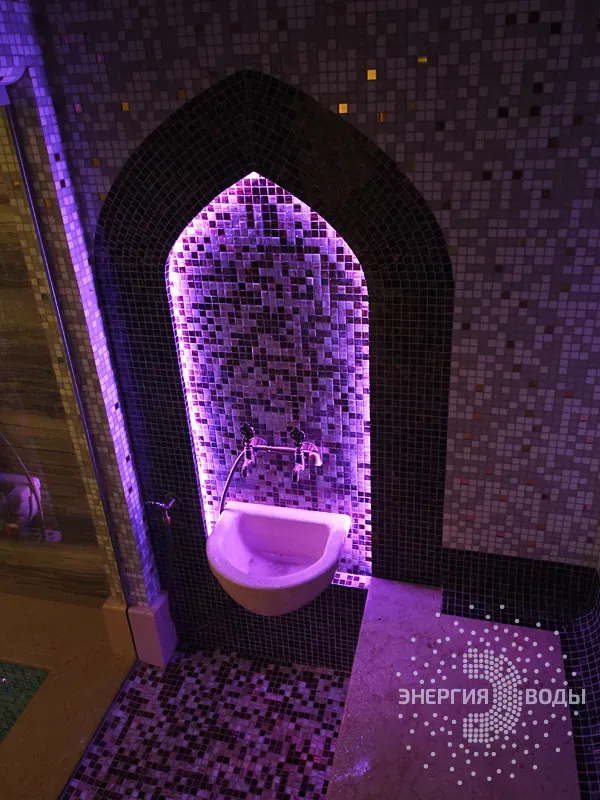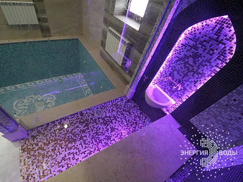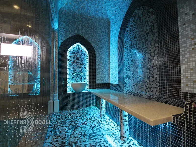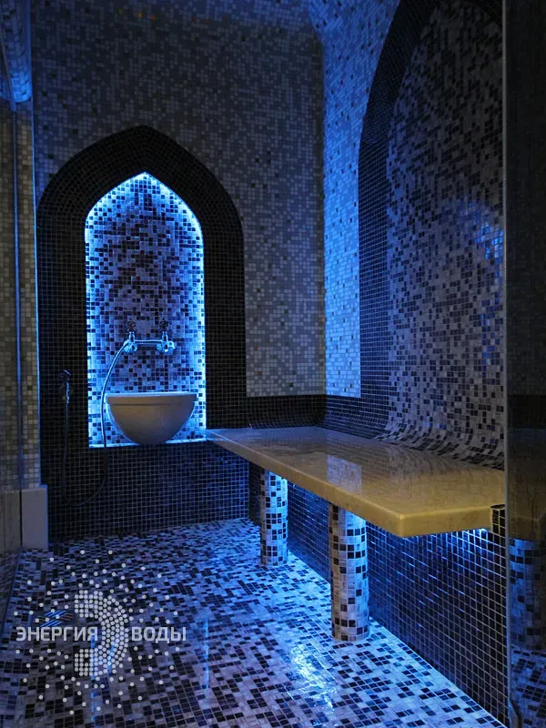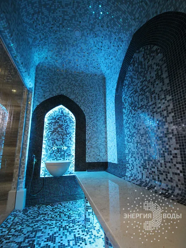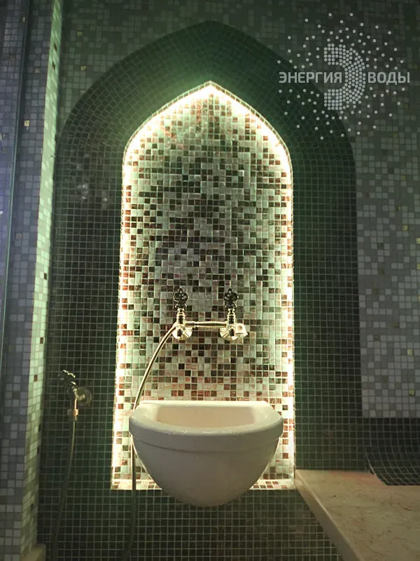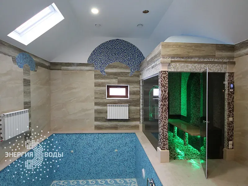 Строительство турецкой бани в Силичах под ключ. Компактный хаммам встроен в совсем небольшое пространство. Благодаря панорамному остеклению в парной светло и можно наблюдать за бассейном. В интерьере хаммама с восточными нотками использована мозаика, а также натуральный камень. Сантехника в османском стиле, установлена RGB подсветка.