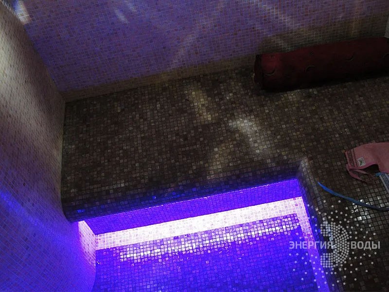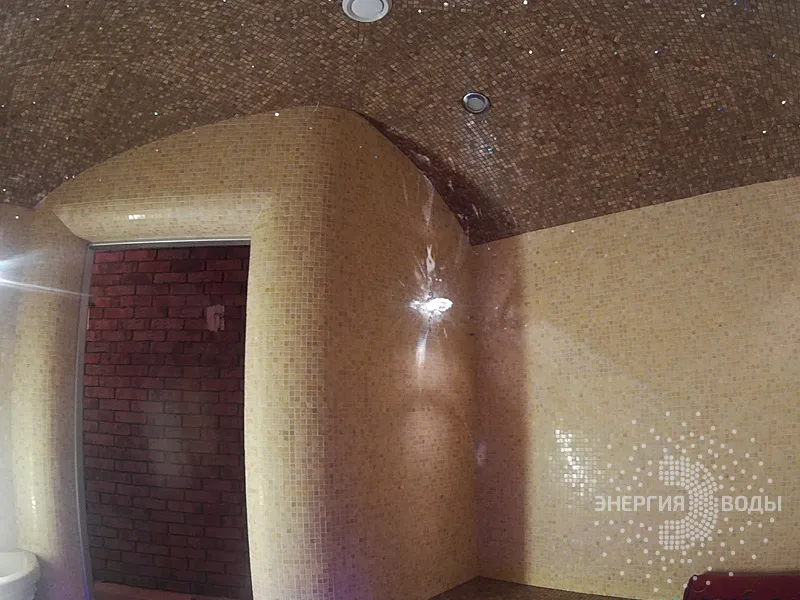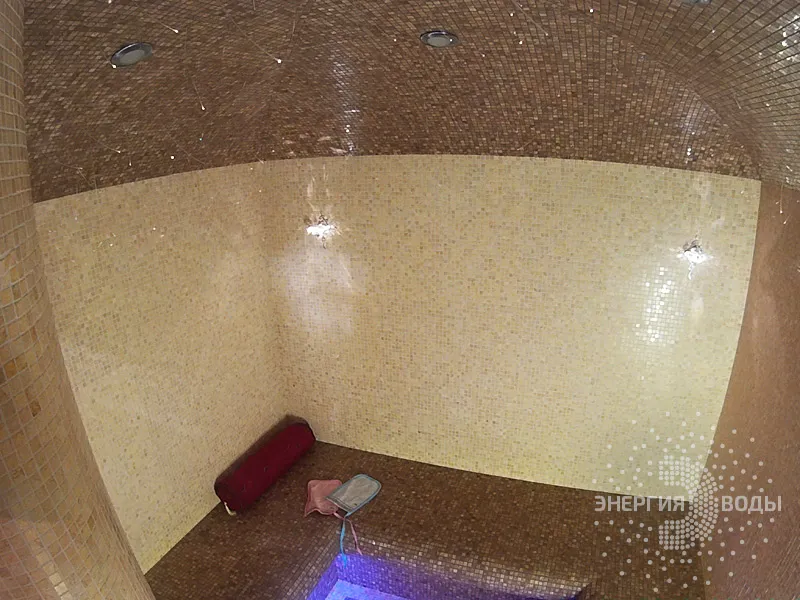 Строительство турецкой бани в Токсово под ключ. Компактный хаммам облицован мозаикой. Под скамейки установлена RGB подсветка. Сказочное настроение восточной сказки помогает создать звездное небо, финские светильники-алмазы Cariitti Kihla, а также аксессуары.