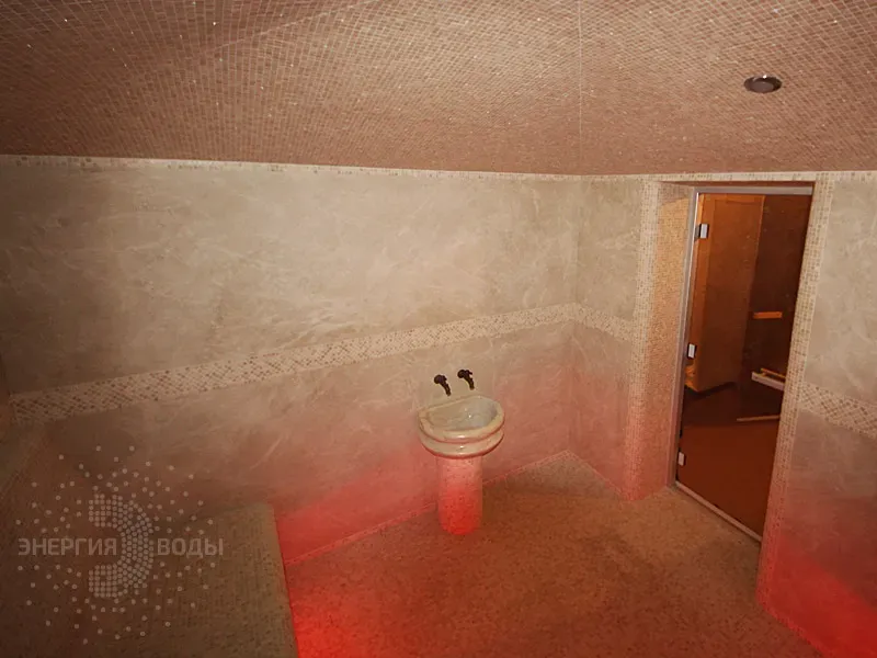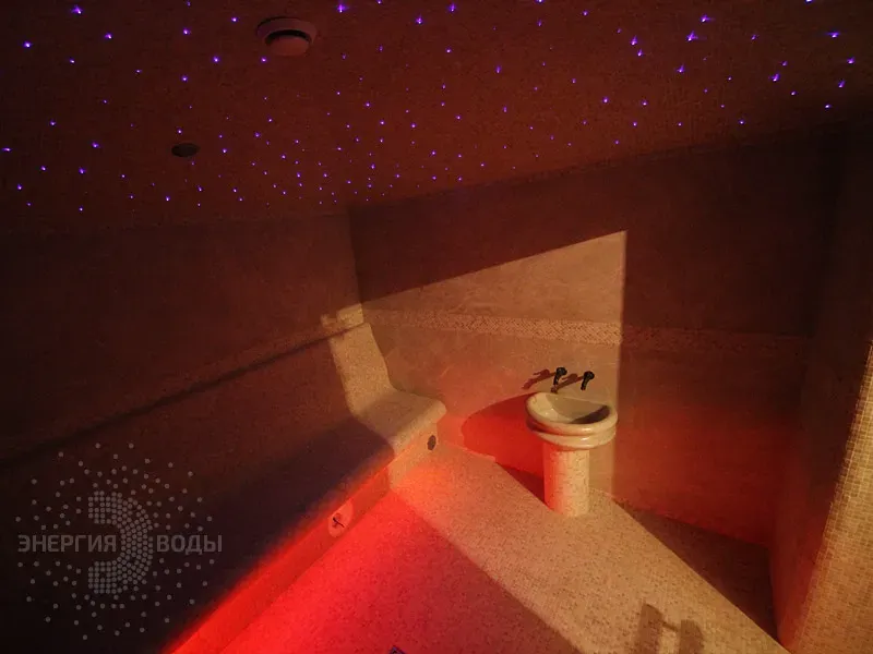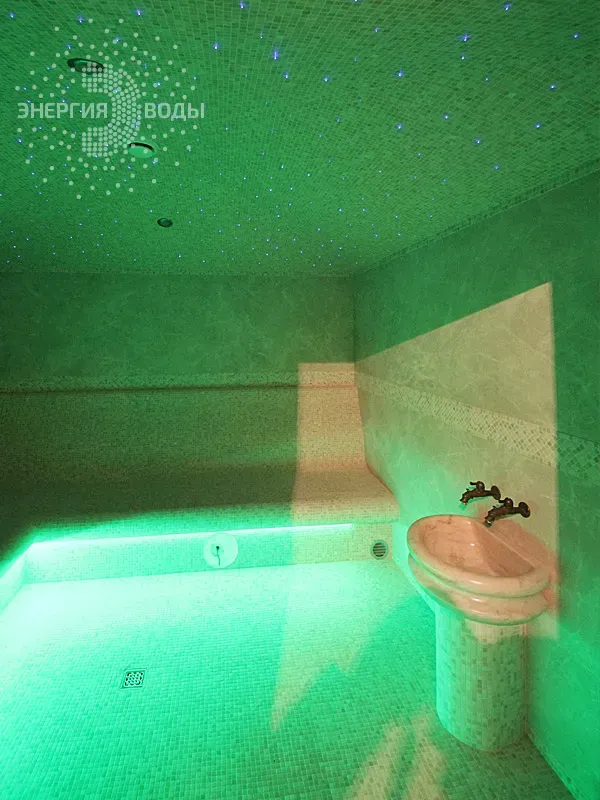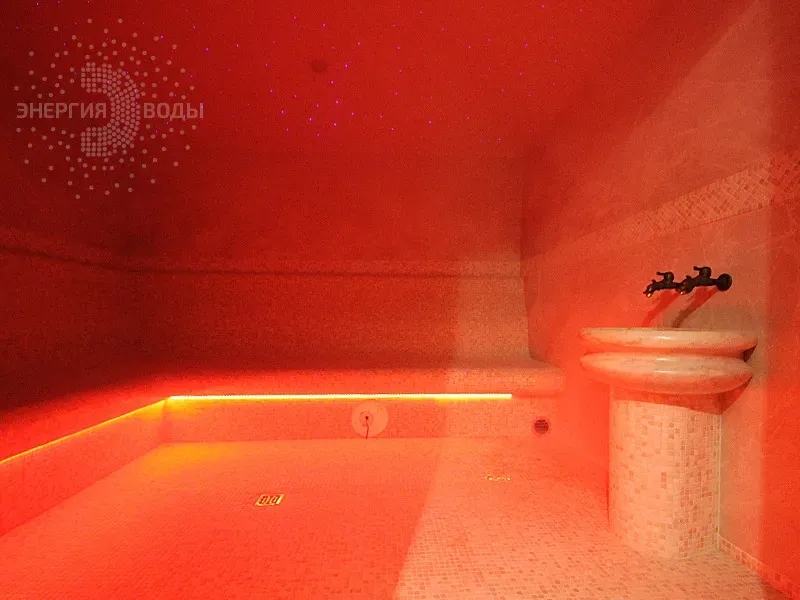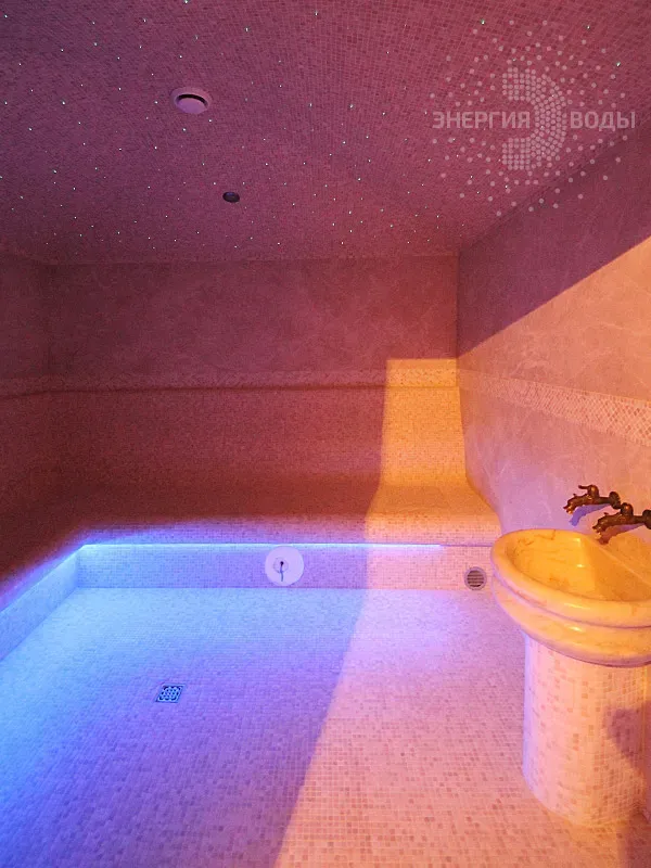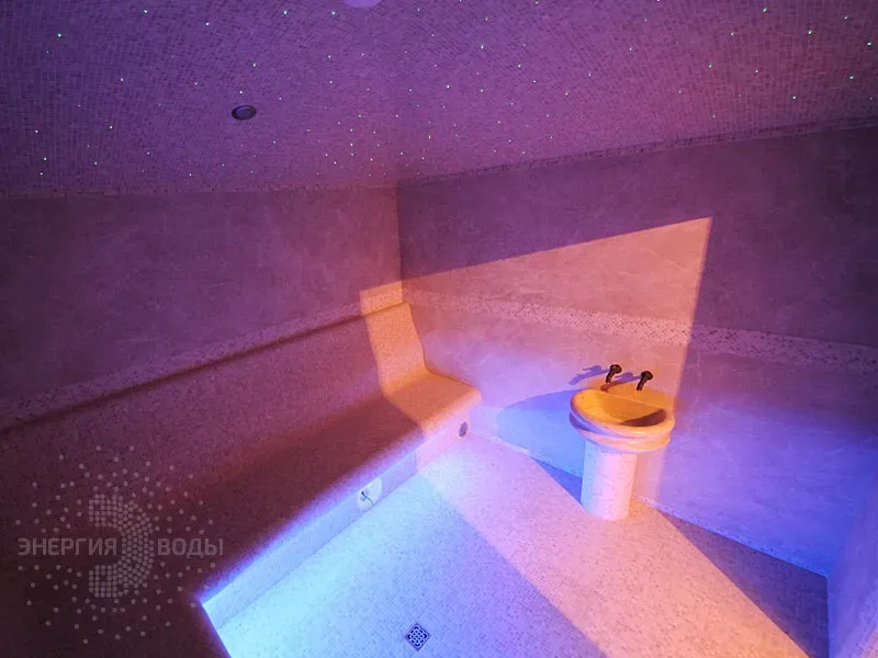 Строительство хаммама в г. Верхнедвинск под ключ. Установлена курна из натурального мрамора. Светодиодная RGB подсветка и имитация звездного неба на куполе турецкой бани создают волшебную атмосферу.