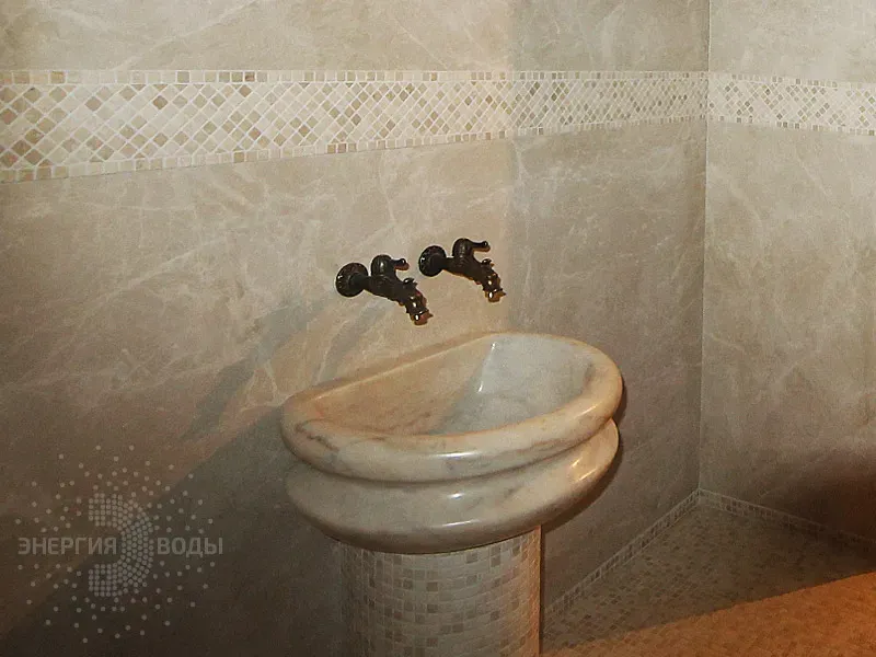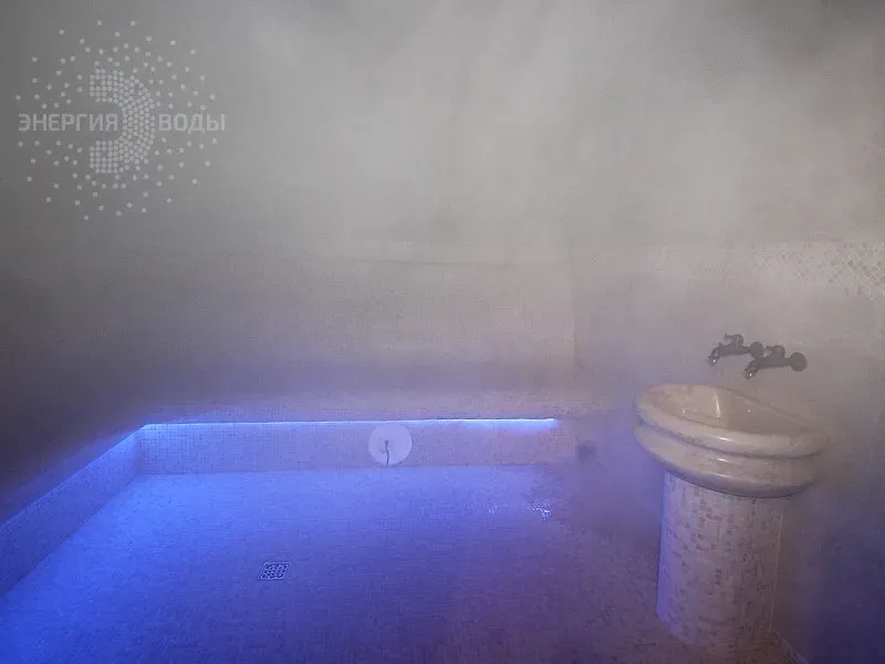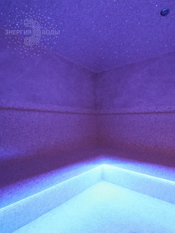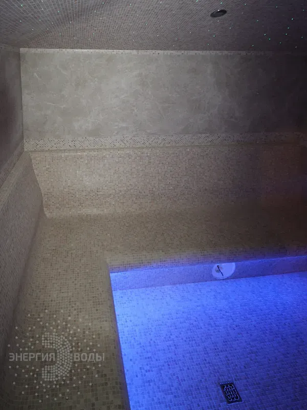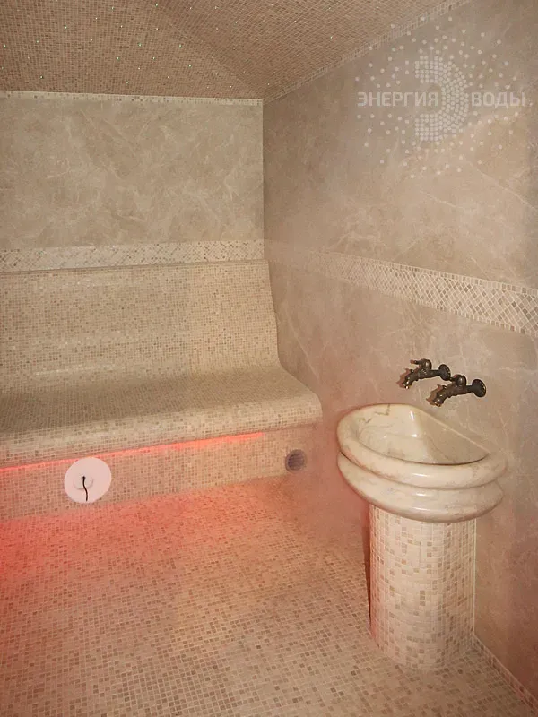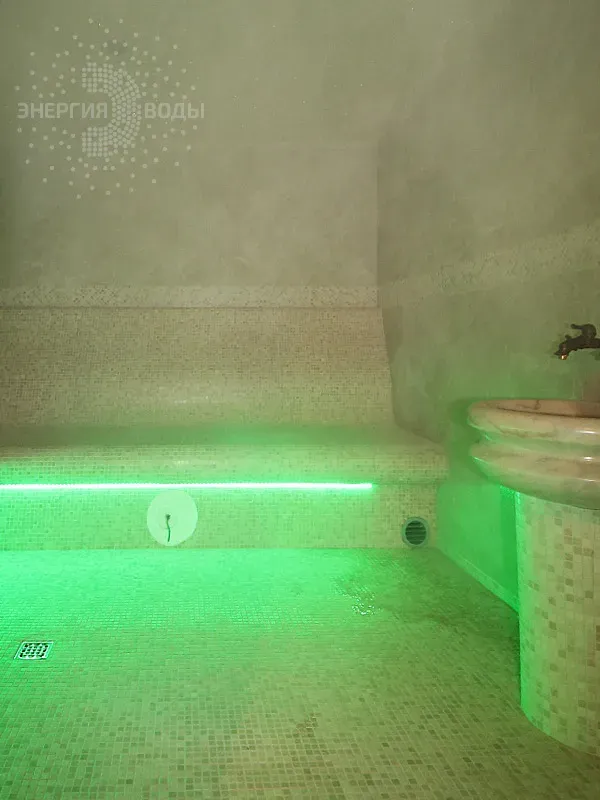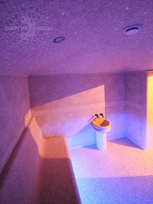 Строительство хаммама в г. Верхнедвинск под ключ. Установлена курна из натурального мрамора. Светодиодная RGB подсветка и имитация звездного неба на куполе турецкой бани создают волшебную атмосферу.