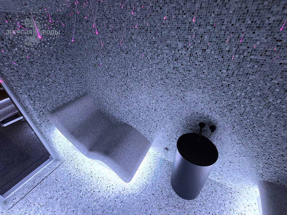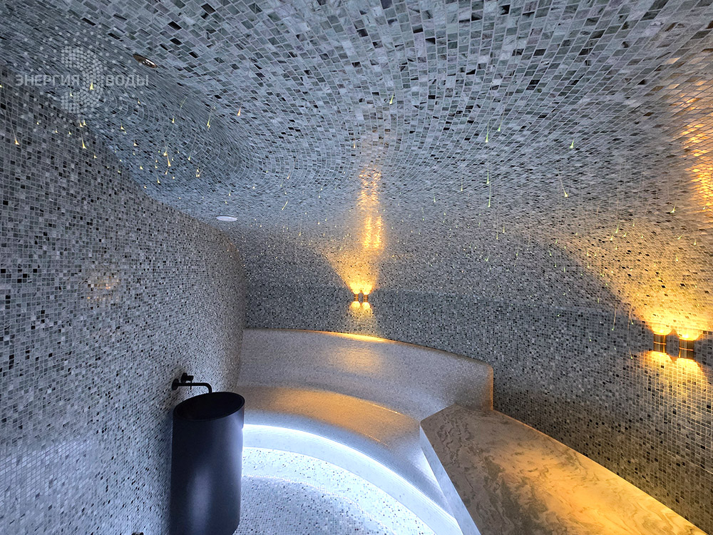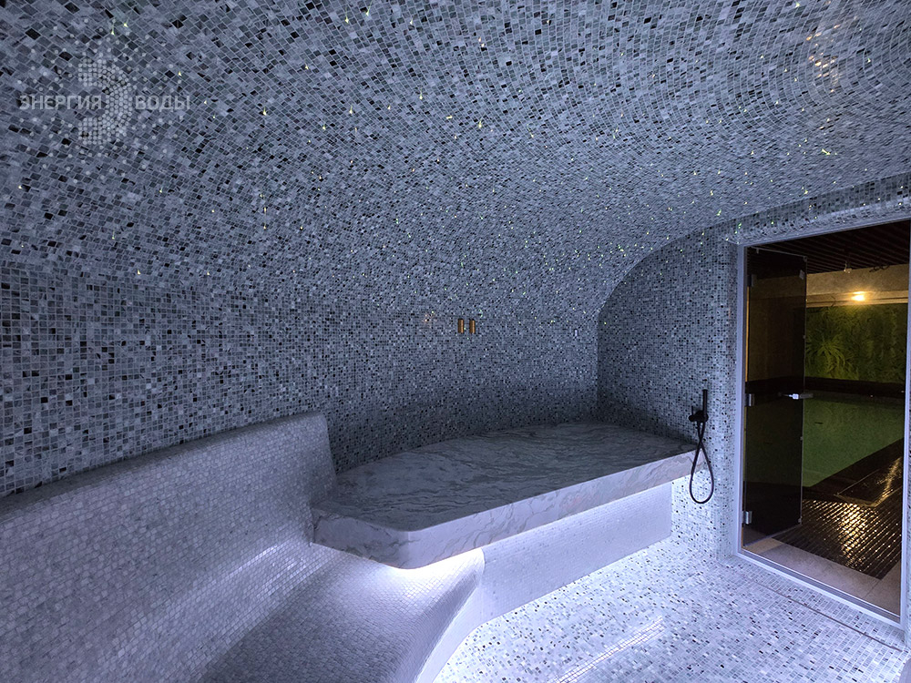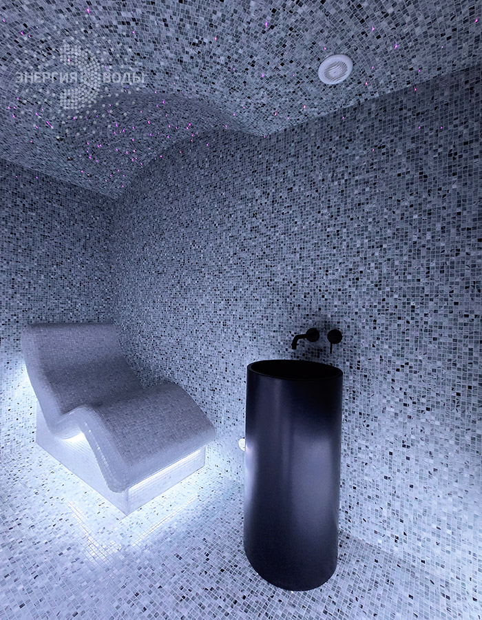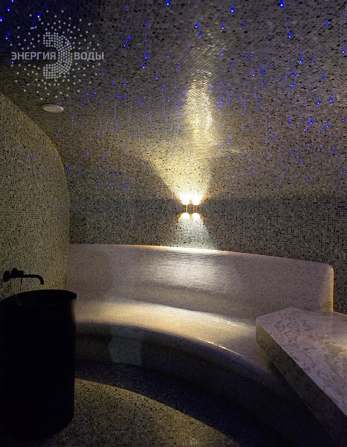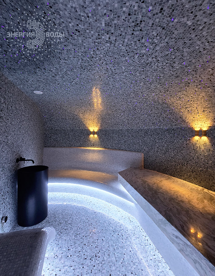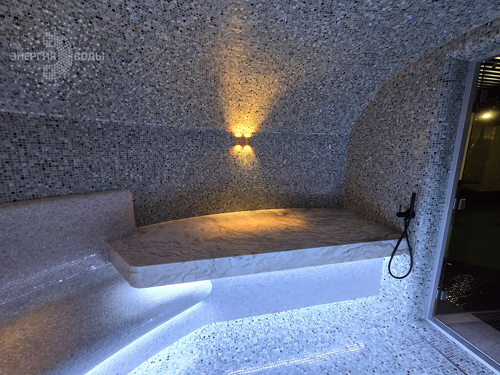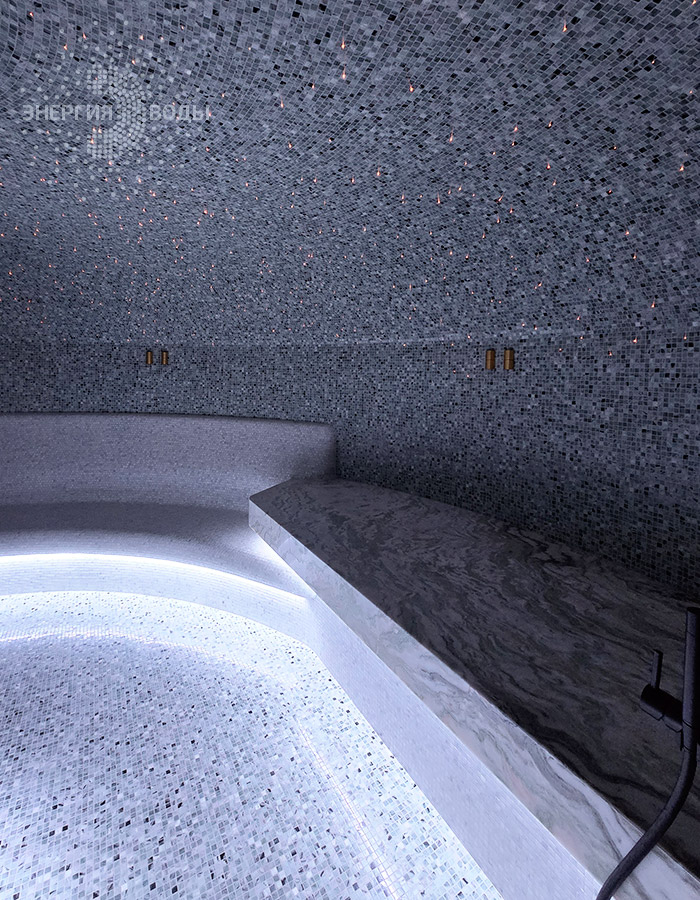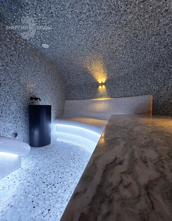 Строительство современного хаммама. Парная турецкой бани необычной формы с закруглённой стеной. Анатомический лежак и массажный стол позволяют проводить любимые процедуры максимально комфортно. Стильная тёмная курна добавляет графики в лаконичный интерьер хаммама. За освещение отвечают Звездное небо, контурная подсветка скамьи и лежаков, а также точечные светильники Cariitti.