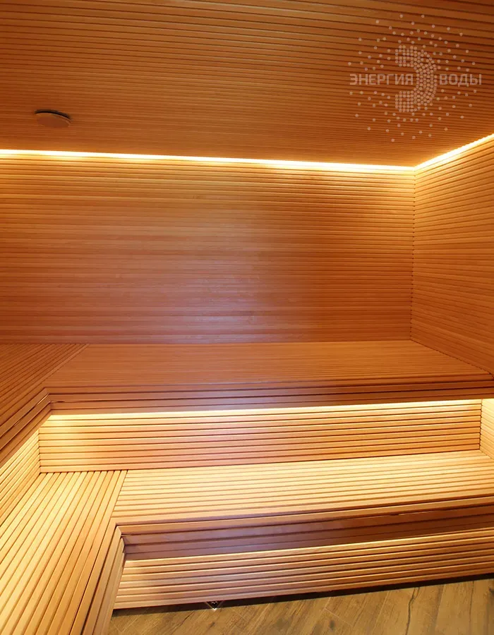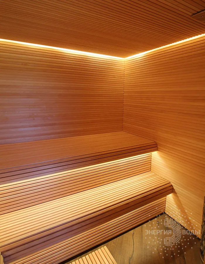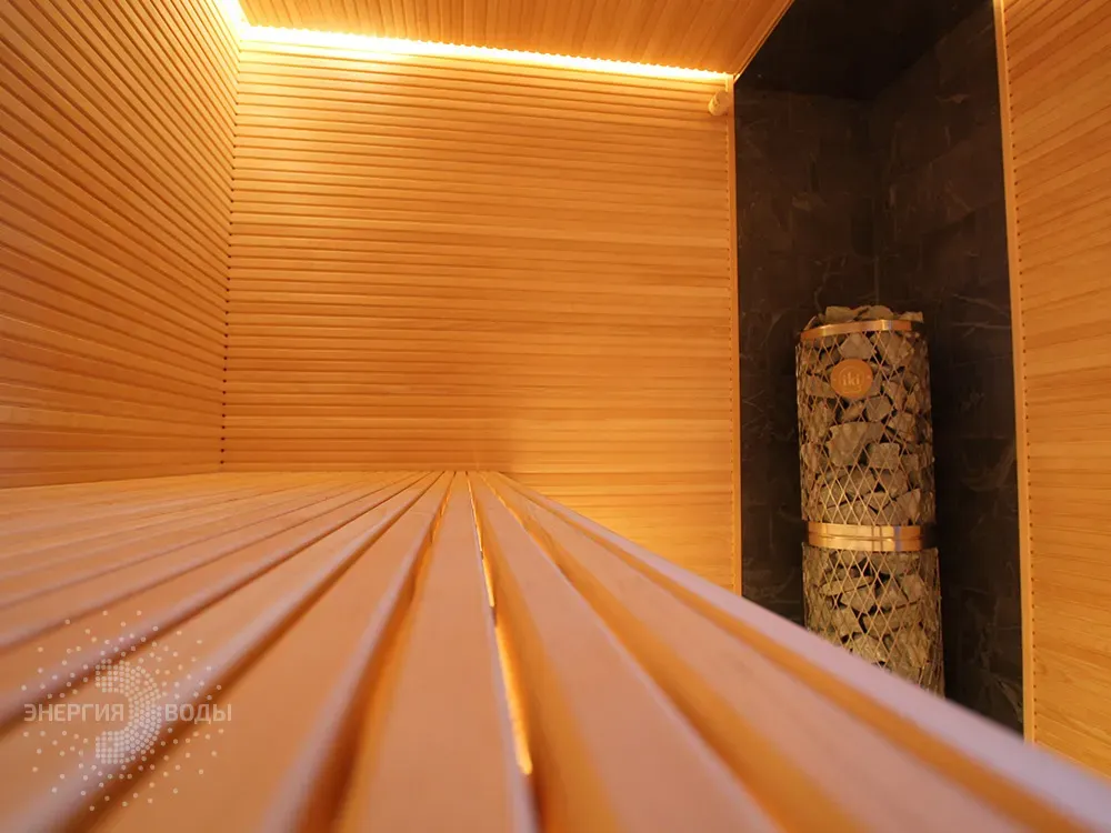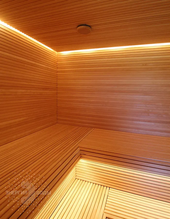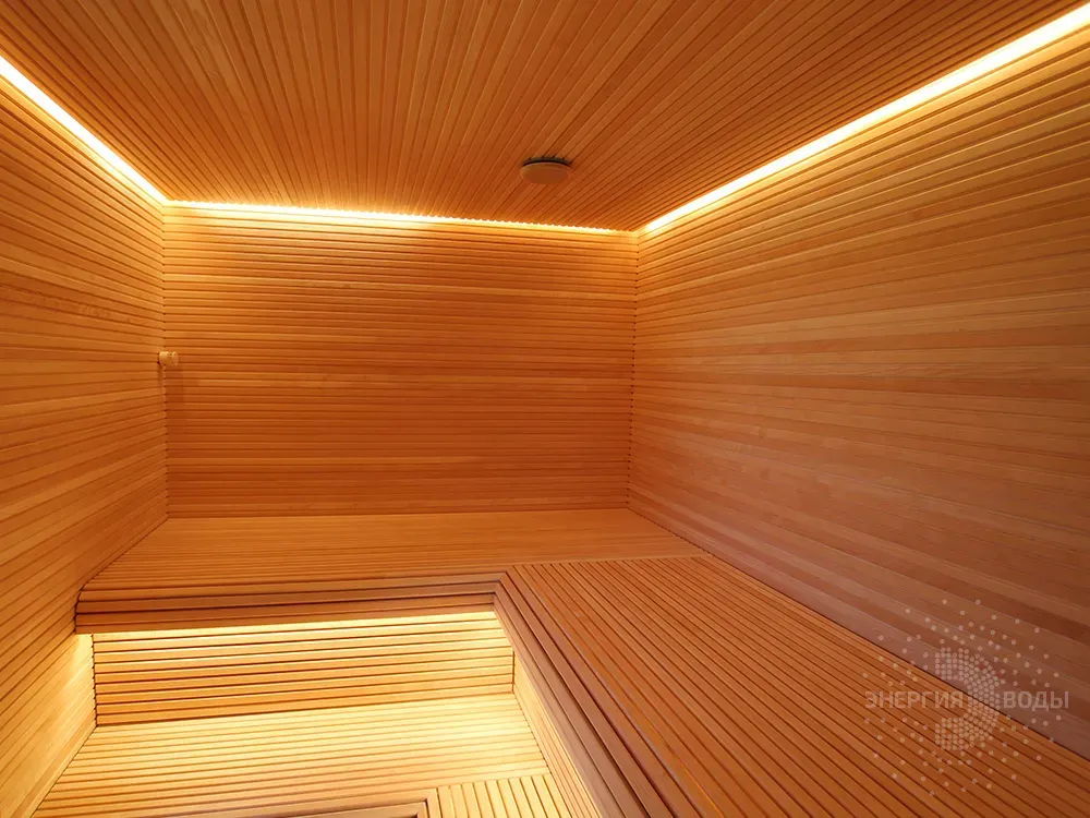 Строительство бани под ключ. Отделка стен и полков выполнены из алтайского кедра. Установлена финская электрокаменка IKI Pillar. Контурная подсветка потолка и полков делает интерьер бани еще более комфортным и современным.