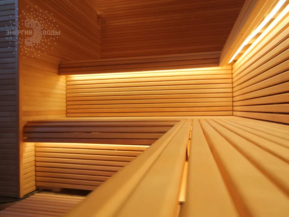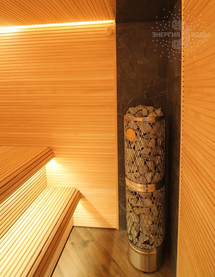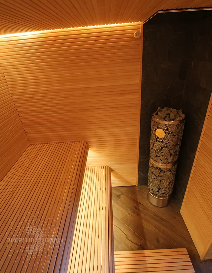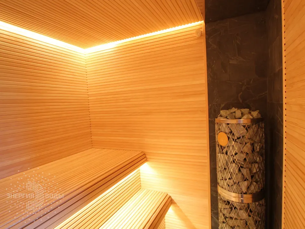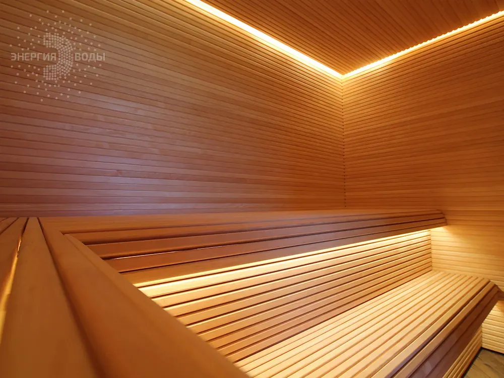 Строительство бани под ключ. Отделка стен и полков выполнены из алтайского кедра. Установлена финская электрокаменка IKI Pillar. Контурная подсветка потолка и полков делает интерьер бани еще более комфортным и современным.