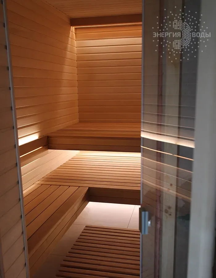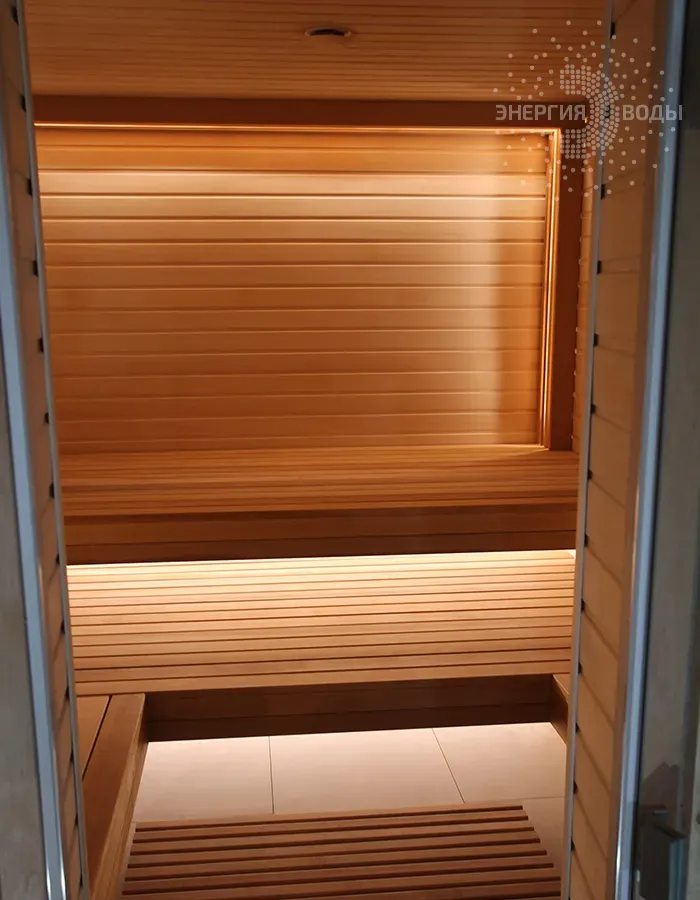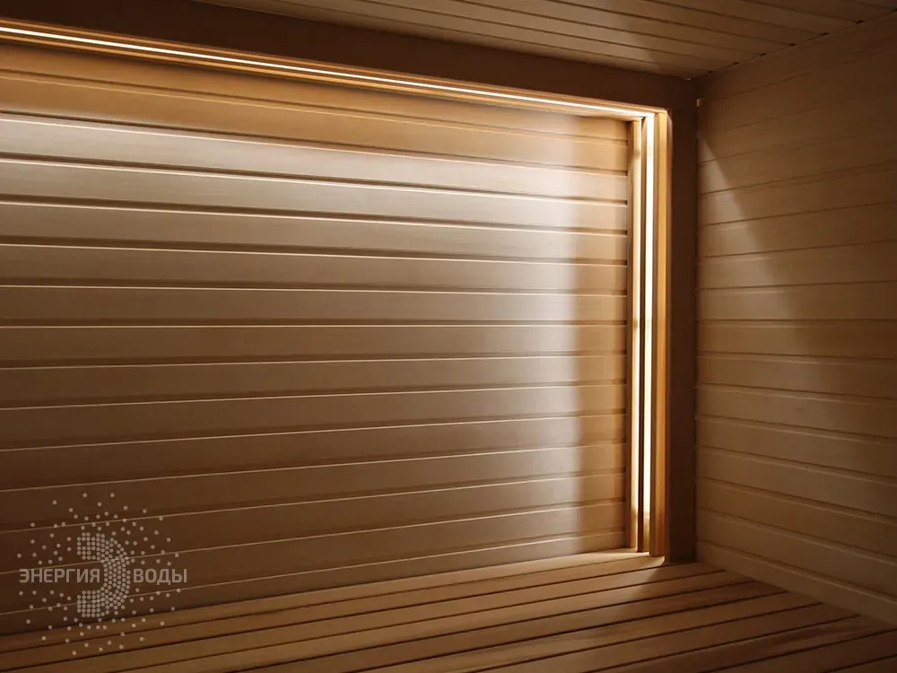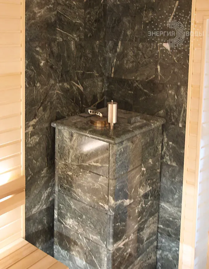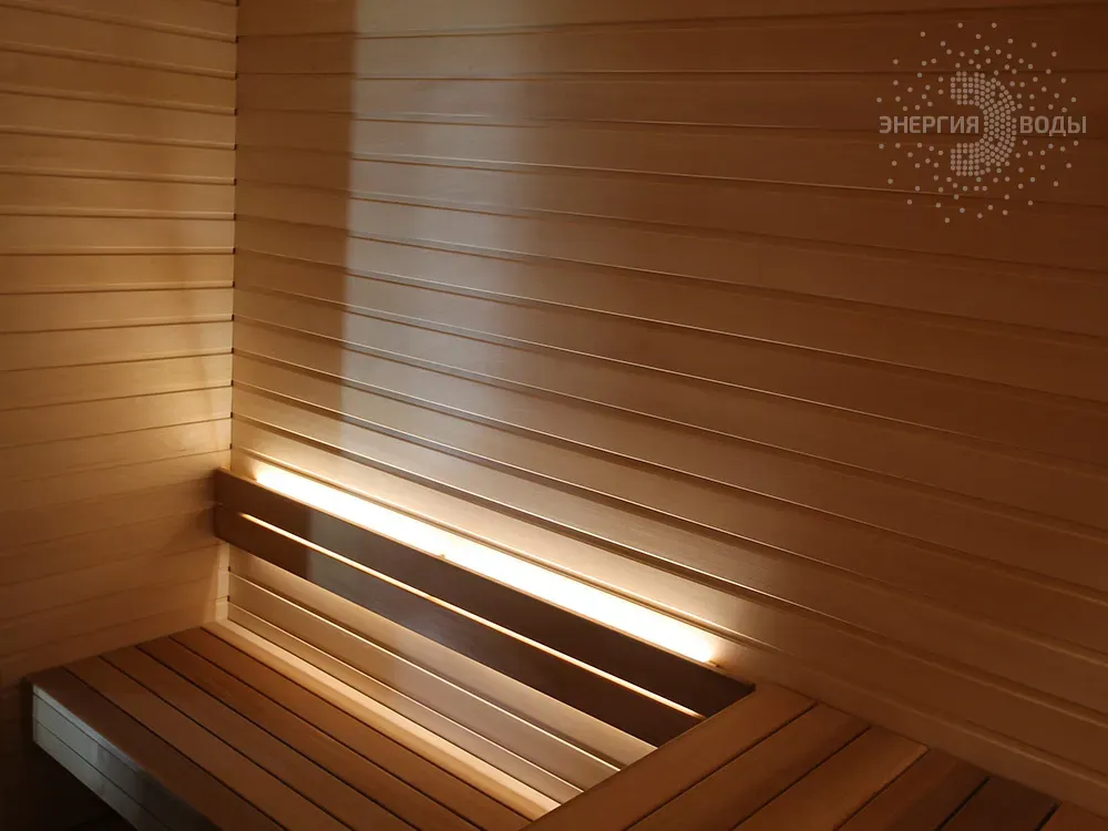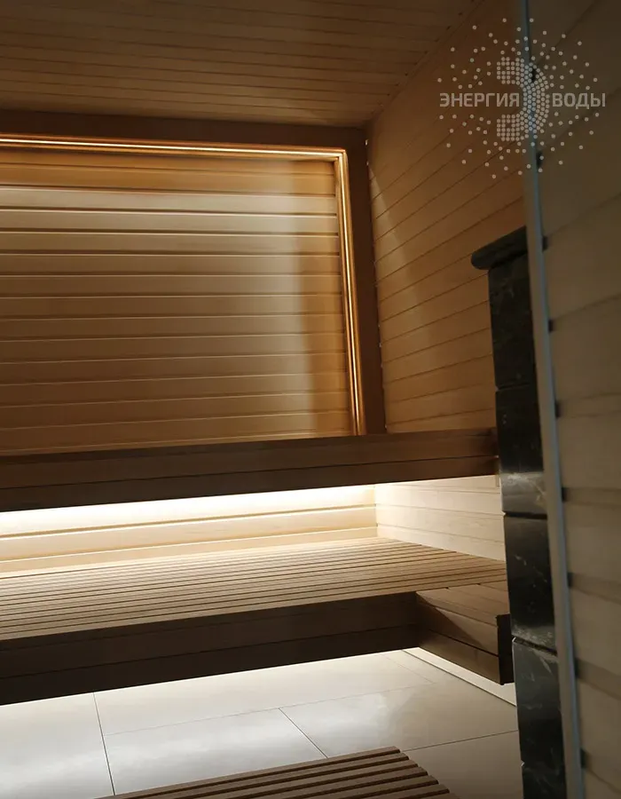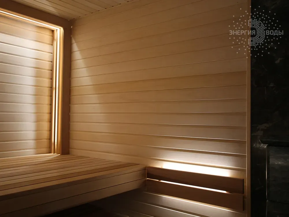 Строительство бани в Гродно под ключ. Установлена дровяная печь EASYSTEAM. Кожух каменки и стены за печью выполнены из природного камня – он является теплоаккумулирующим экраном и защищает от жесткого излучения. Стильный и современный дизайн полков подчеркнут подсветкой.