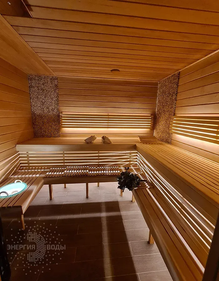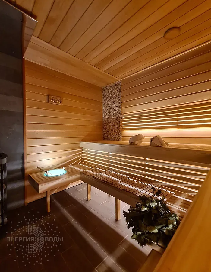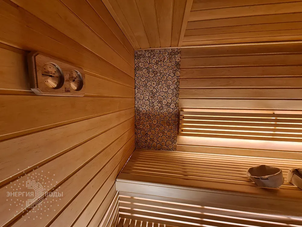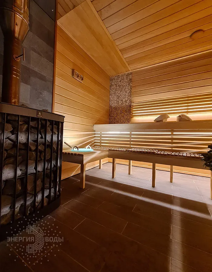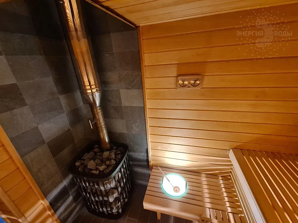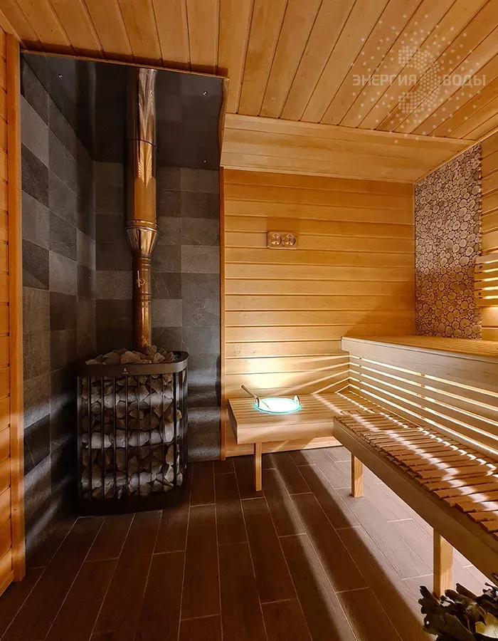 Строительство бани в Сёмково под ключ. Установлена финская дровяная печь каменка Kastor. Стены за каменкой облицованы натуральным камнем талькохлоритом. Панно из можжевельника в бане – не только элемент декора. При взаимодействии с ним пар насыщается можжевеловым ароматом и эфирными маслами.