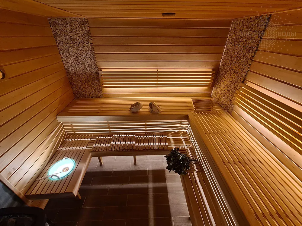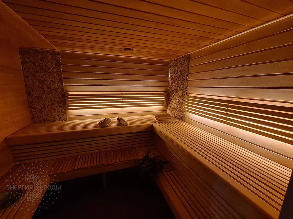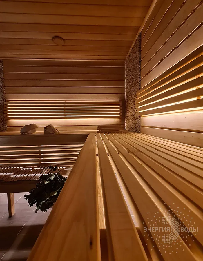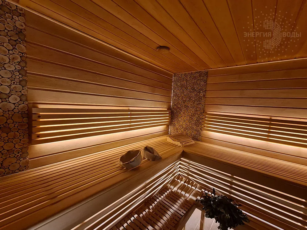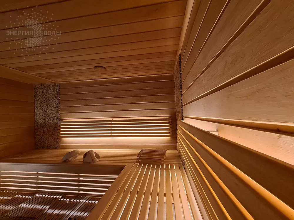 Строительство бани в Сёмково под ключ. Установлена финская дровяная печь каменка Kastor. Стены за каменкой облицованы натуральным камнем талькохлоритом. Панно из можжевельника в бане – не только элемент декора. При взаимодействии с ним пар насыщается можжевеловым ароматом и эфирными маслами.