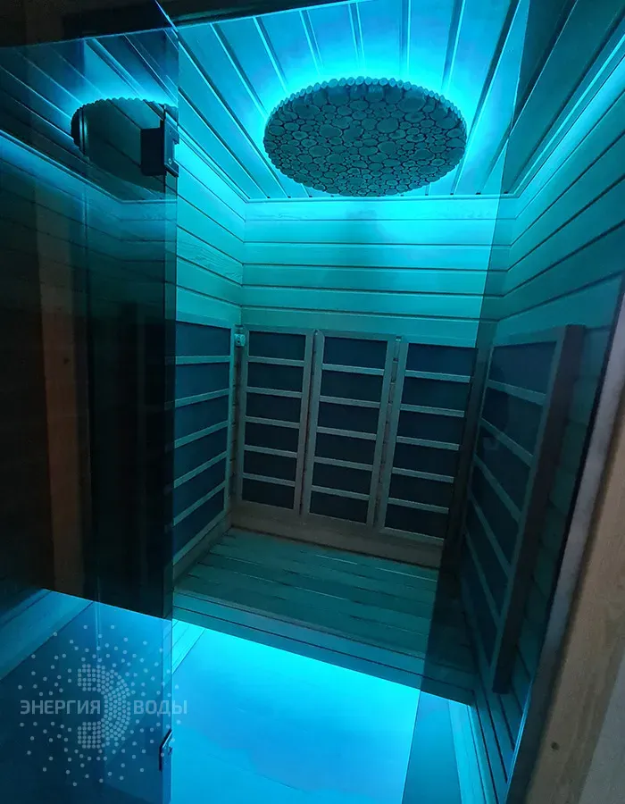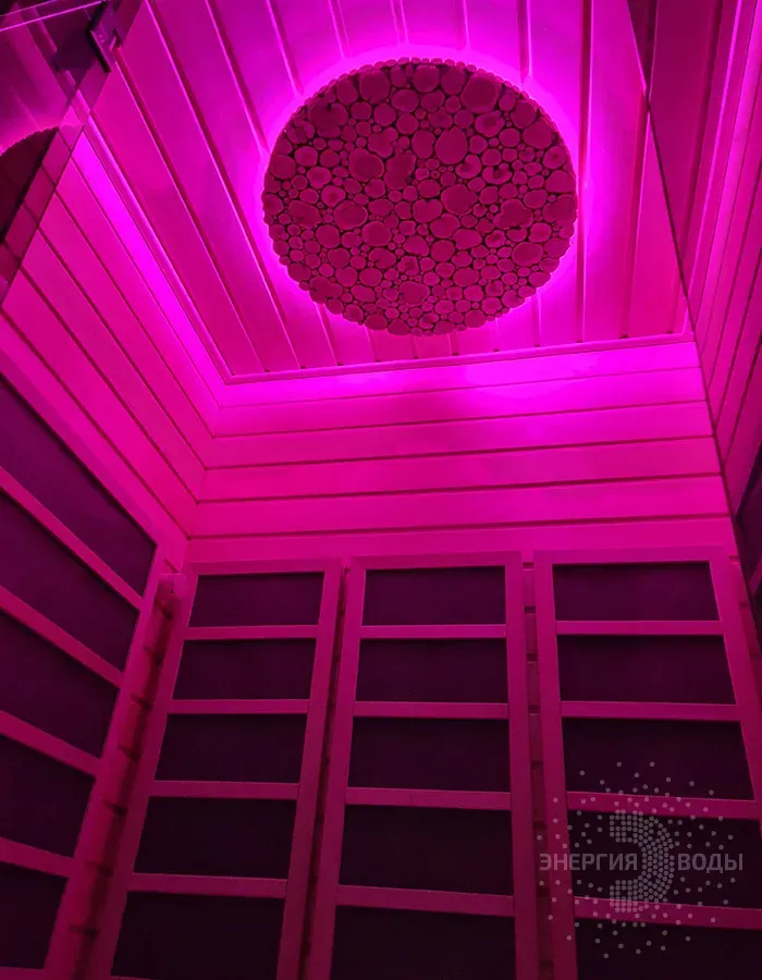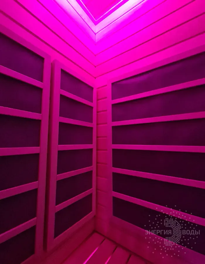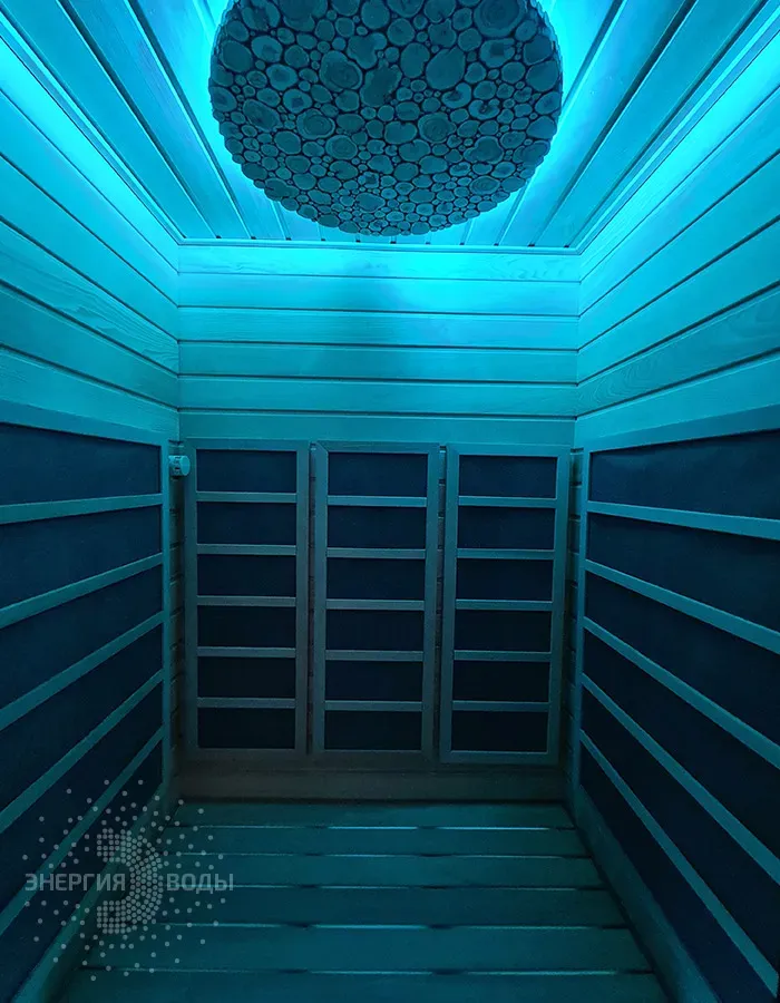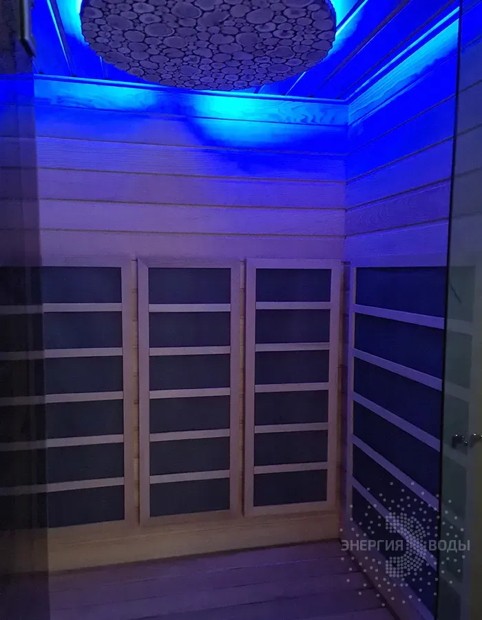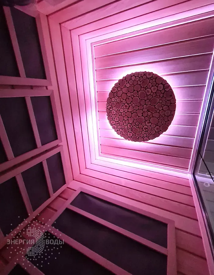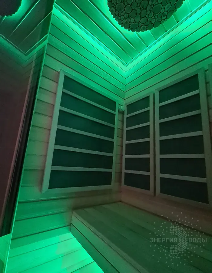 Строительство инфракрасной кабины. Сауна оборудована инфракрасными панелями от шведской компании Tylo. Они обеспечивают быстрый нагрев, даря посетителям тепло практически мгновенно. Можжевеловое панно на потолке наполняет кабину приятным ароматом, а RGB подсветка позволяет создавать разнообразные световые сценарии под настроение.