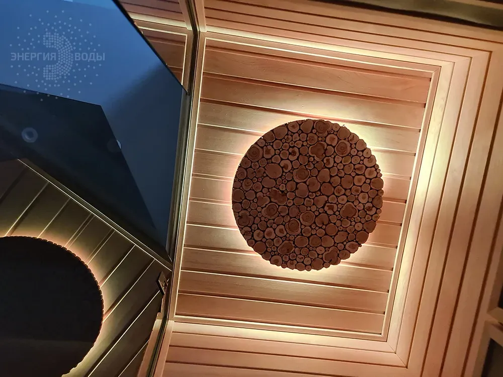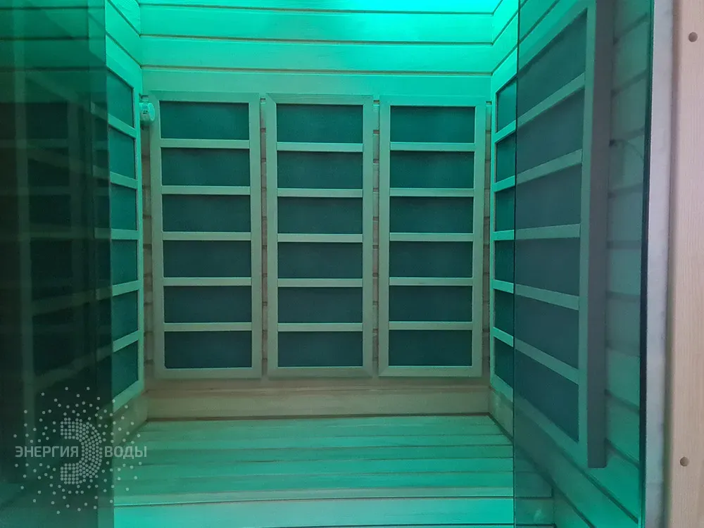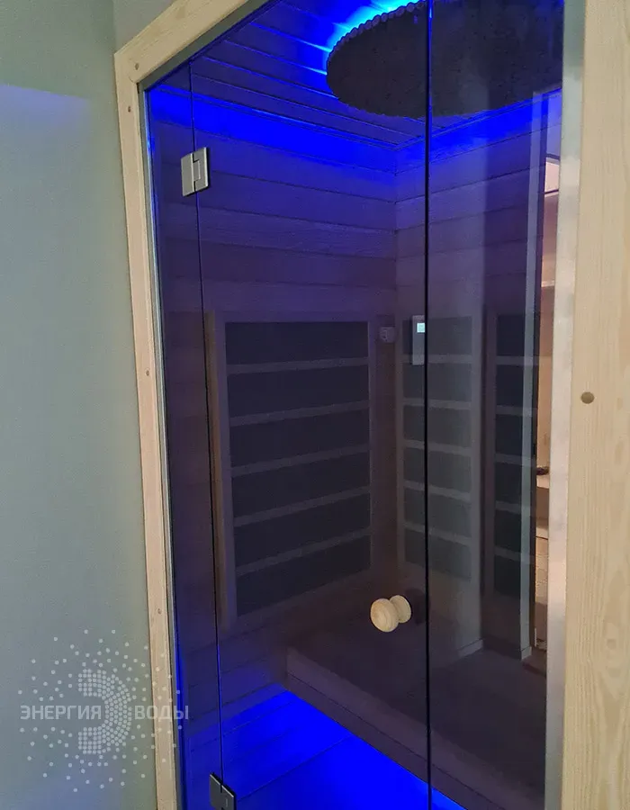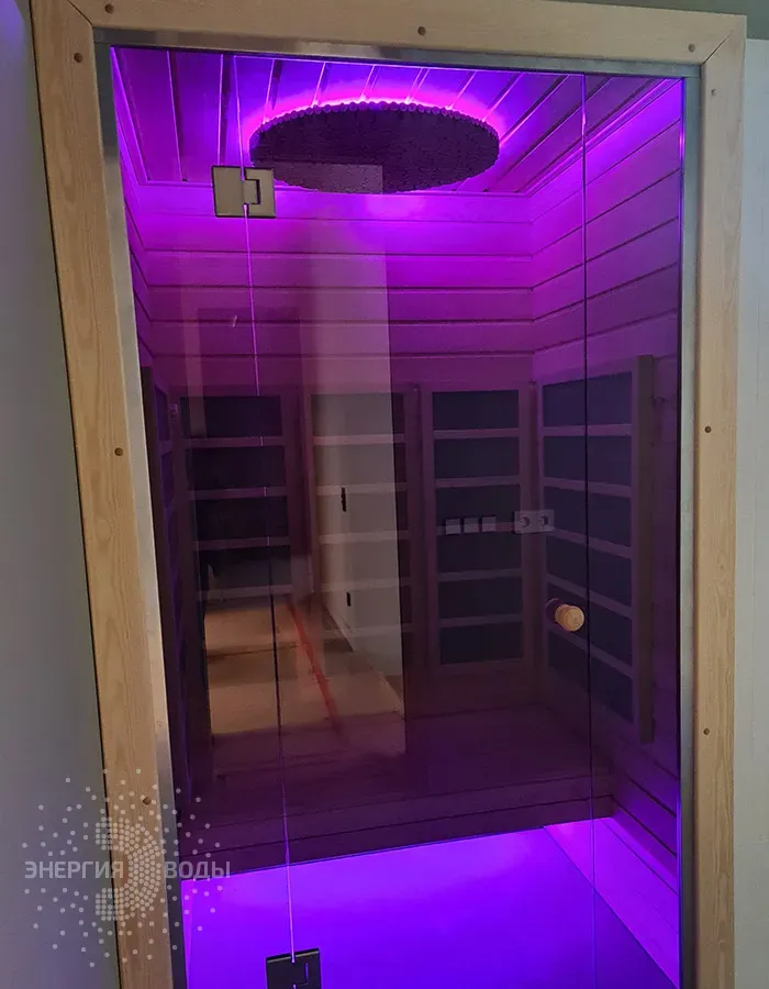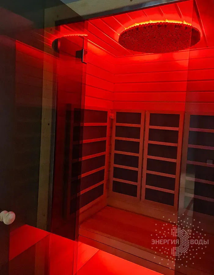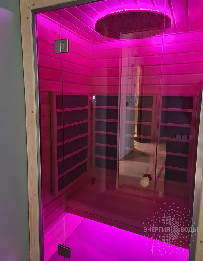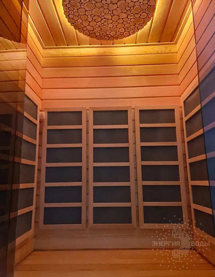 Строительство инфракрасной кабины. Сауна оборудована инфракрасными панелями от шведской компании Tylo. Они обеспечивают быстрый нагрев, даря посетителям тепло практически мгновенно. Можжевеловое панно на потолке наполняет кабину приятным ароматом, а RGB подсветка позволяет создавать разнообразные световые сценарии под настроение.