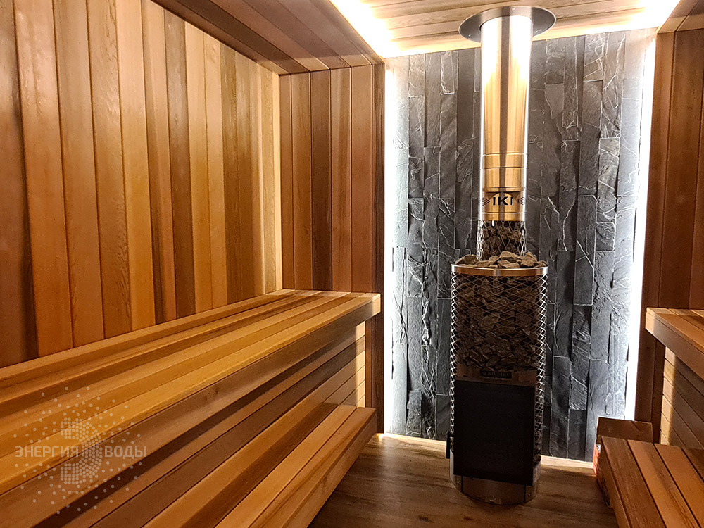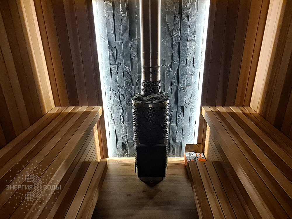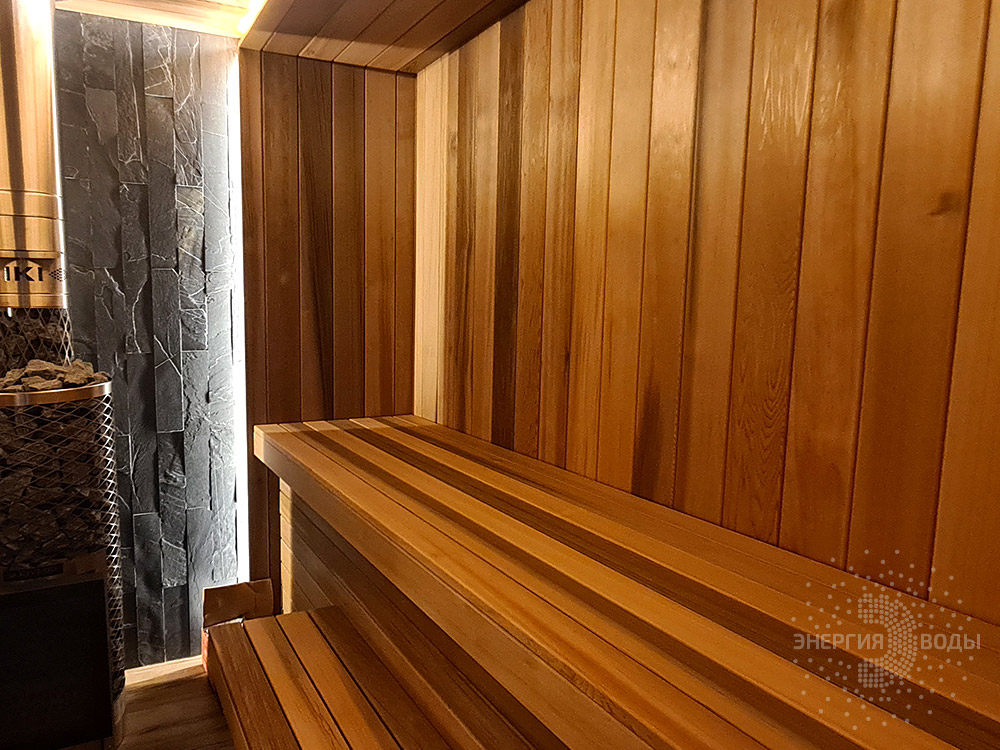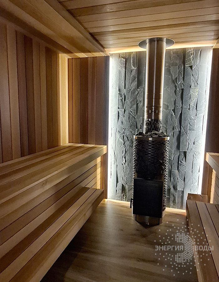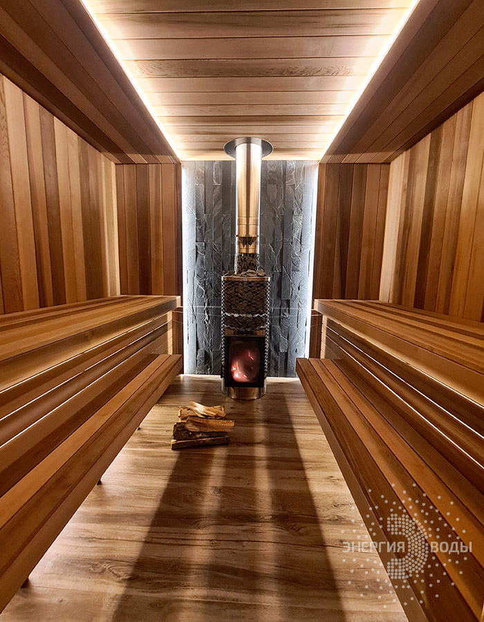 Строительство сауны под ключ. Отделка и полки из кедра наполняют сауну потрясающим ароматом, а несколько сценариев освещения позволяют создавать разное настроение. Финская дровяная печь IKI KIVI с высокой стеклянной дверцей топки даёт возможность наслаждаться пламенем во время отдыха. Также в комплексе обустроена комфортная комната отдыха с отделкой из сосны КЕЛО.