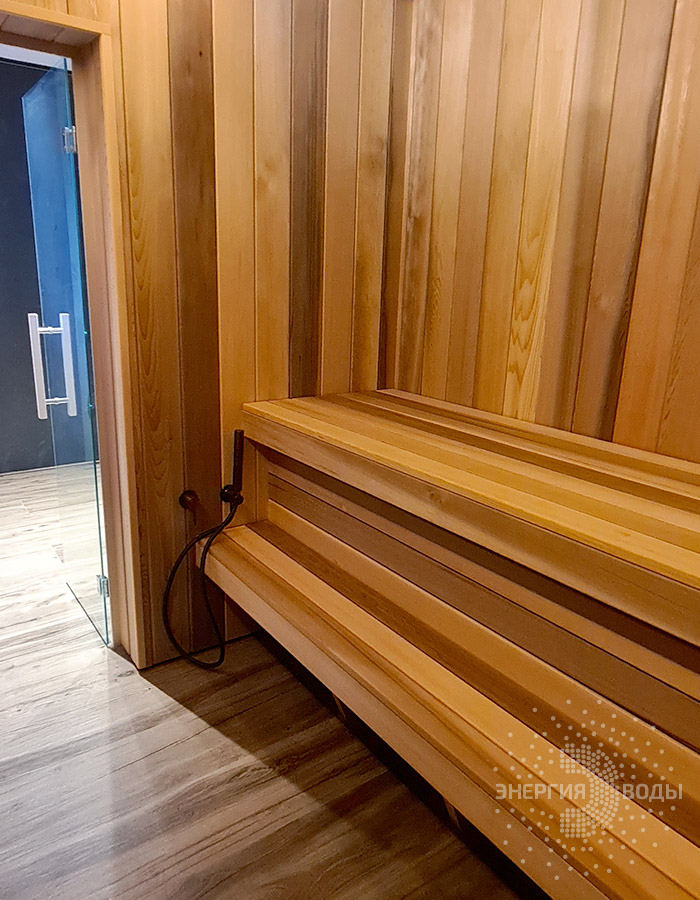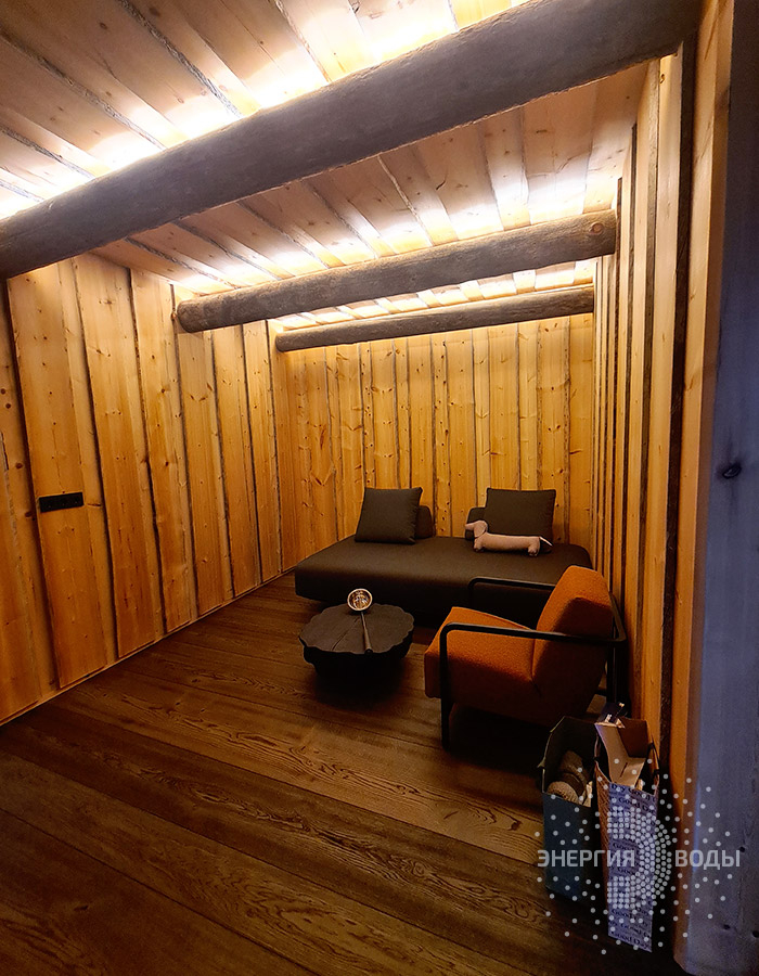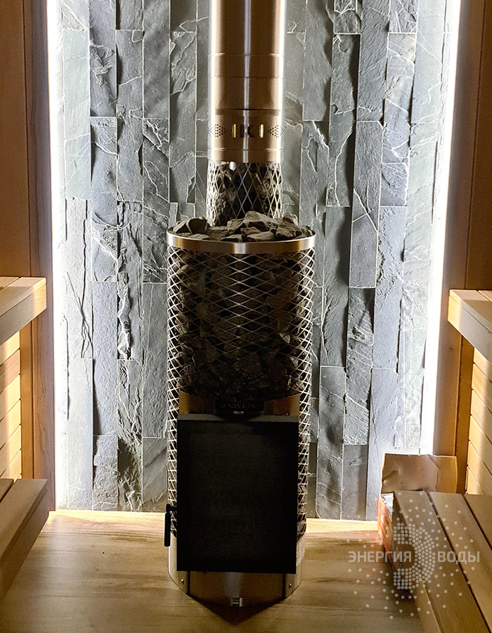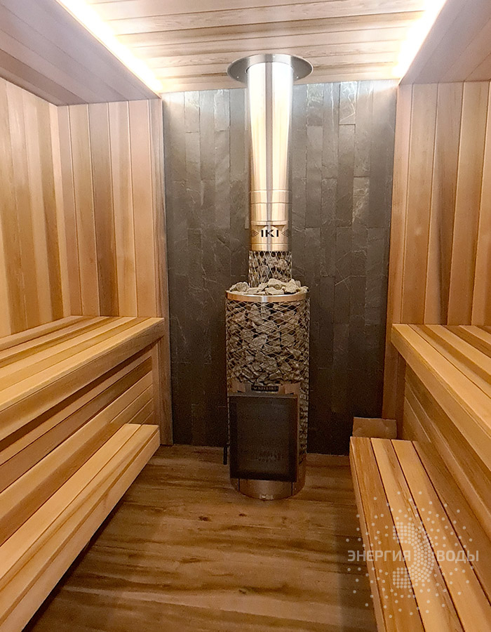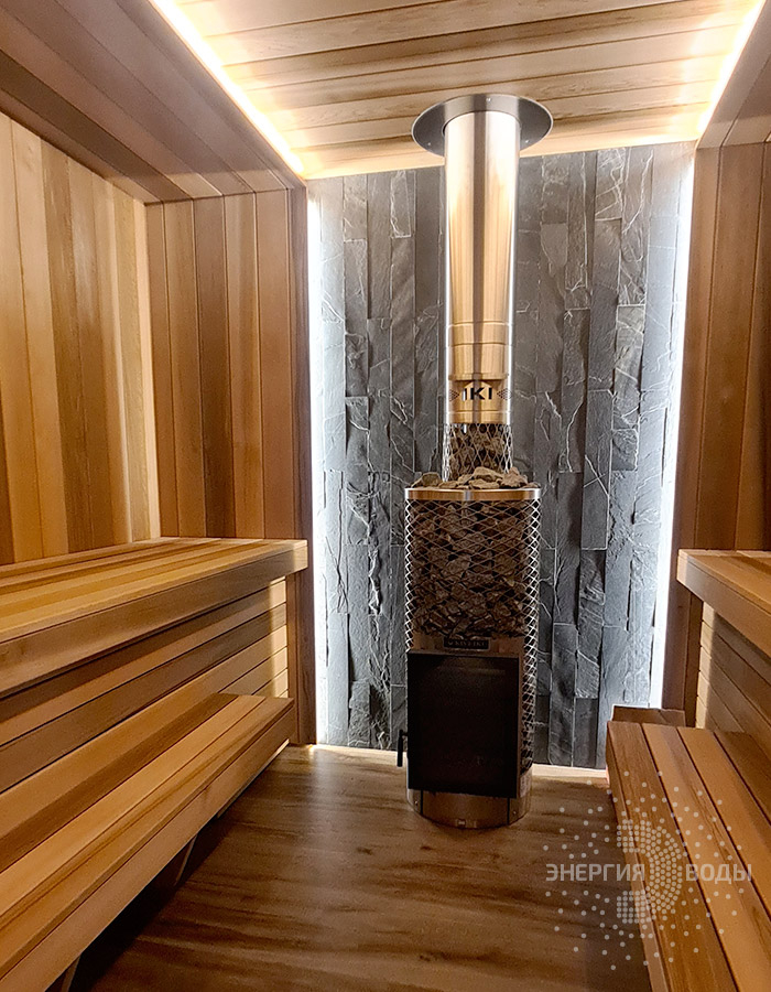 Строительство сауны под ключ. Отделка и полки из кедра наполняют сауну потрясающим ароматом, а несколько сценариев освещения позволяют создавать разное настроение. Финская дровяная печь IKI KIVI с высокой стеклянной дверцей топки даёт возможность наслаждаться пламенем во время отдыха. Также в комплексе обустроена комфортная комната отдыха с отделкой из сосны КЕЛО.