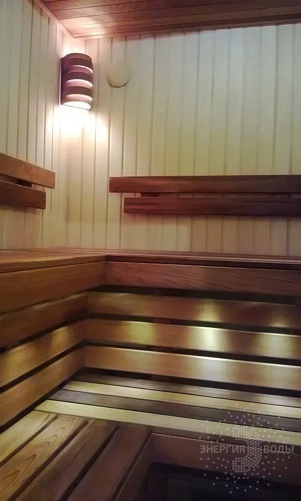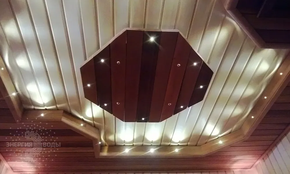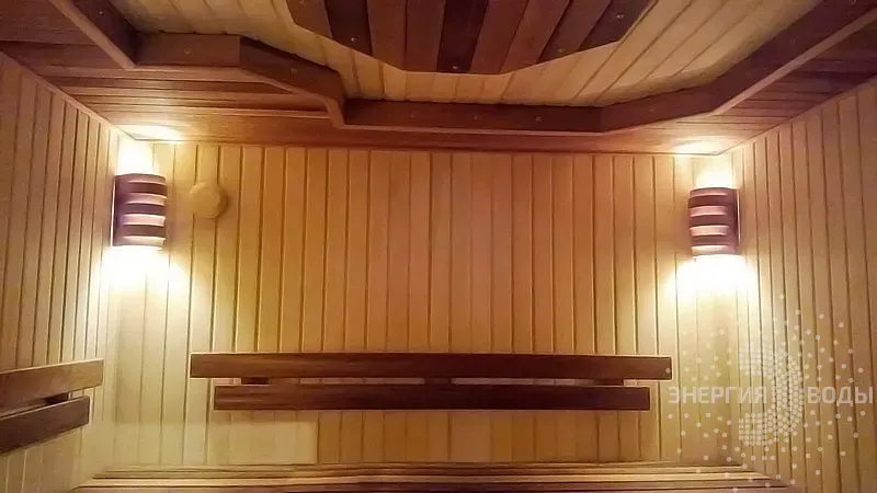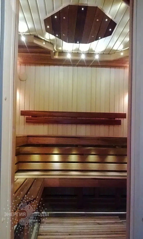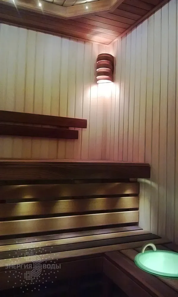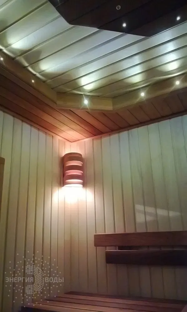 Строительство сауны "Птичь" под ключ. Комбинированная отделка выполнена из темного и светлого дерева. Установлена дровяная печь. Точечное освещение потолка и полков, финская шайка Cariitti IB320 с внешней подсветкой.