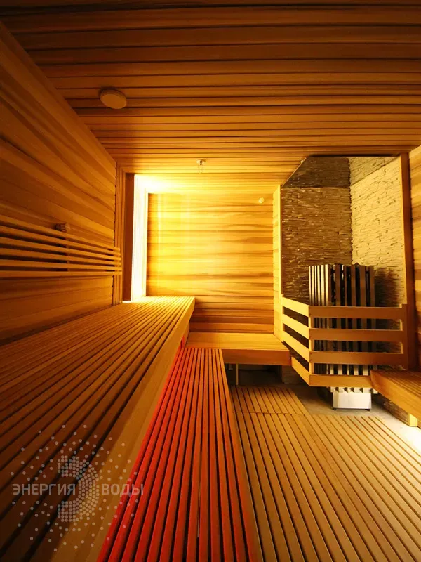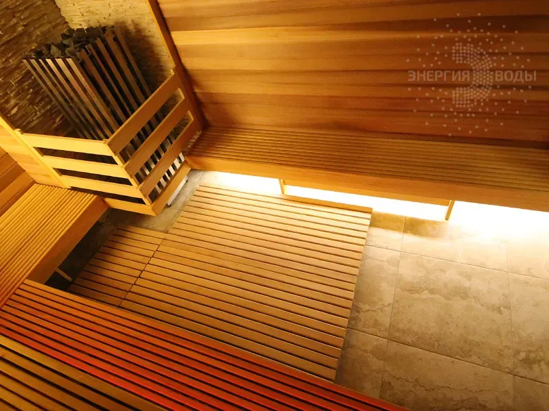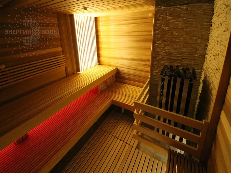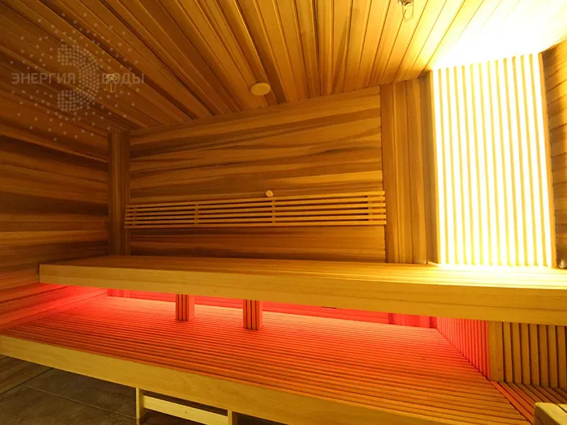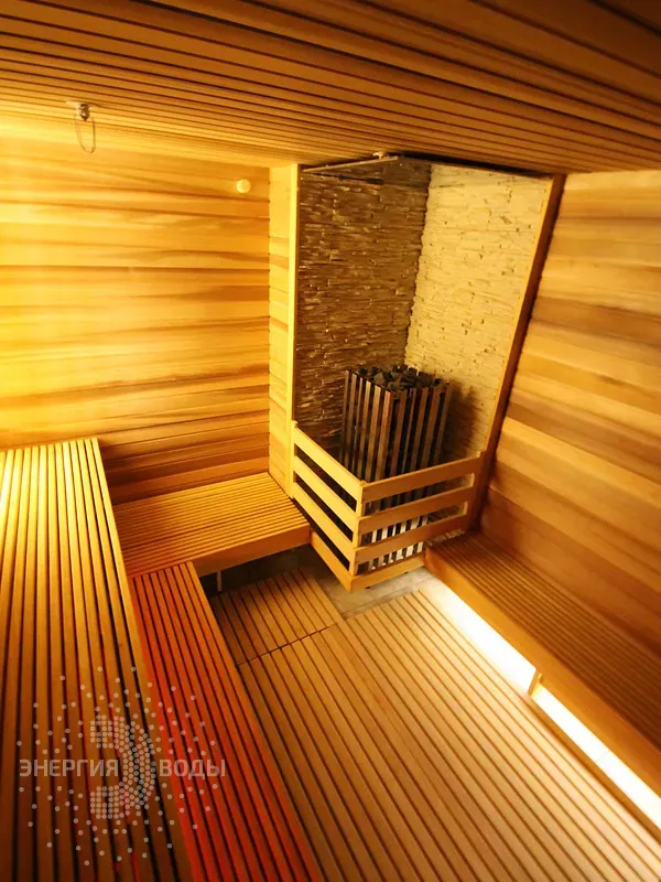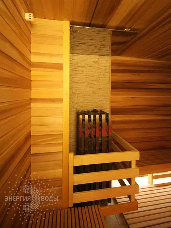 Строительство сауны под ключ. Стены и потолок – канадский кедр. Полки – абаш. Установлена печь IKI Monolit.