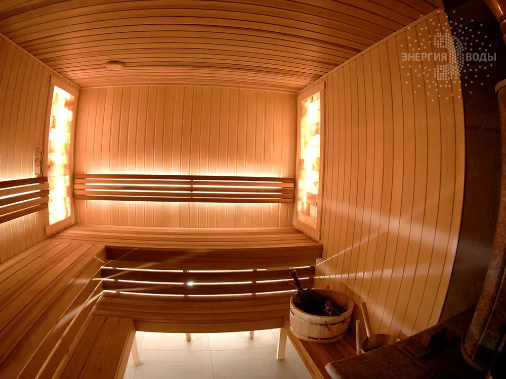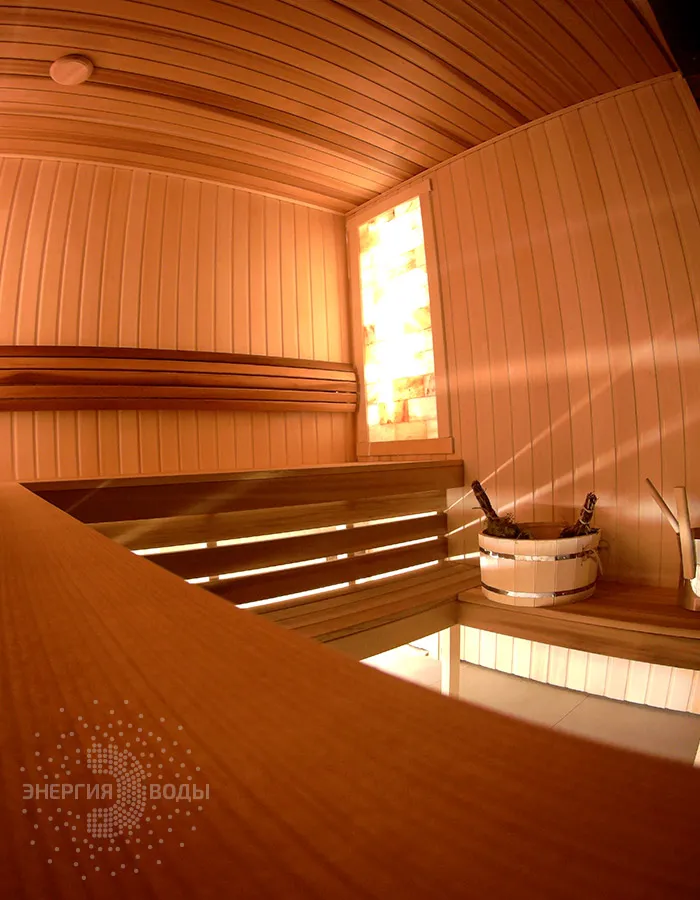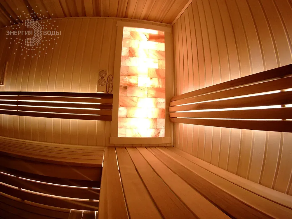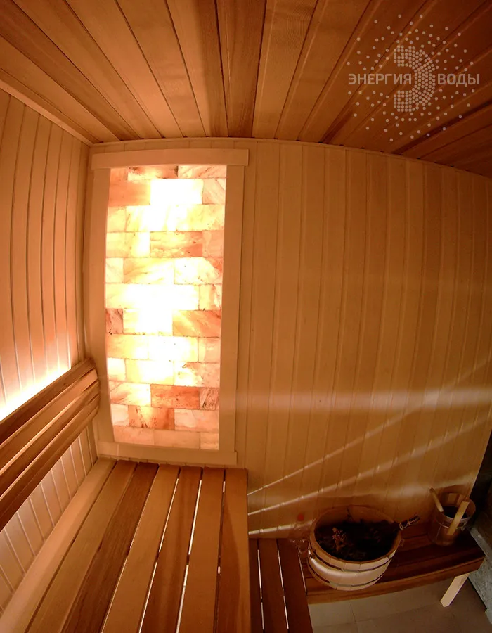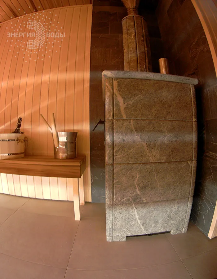 Строительство сауны в д. Вяча под ключ. Дровяная печь облицована талькохлоритом. Отделка стен за каменкой также выполнена из натурального камня. За освещение в сауне отвечает подсветка полков и два световых панно из гималайской соли.