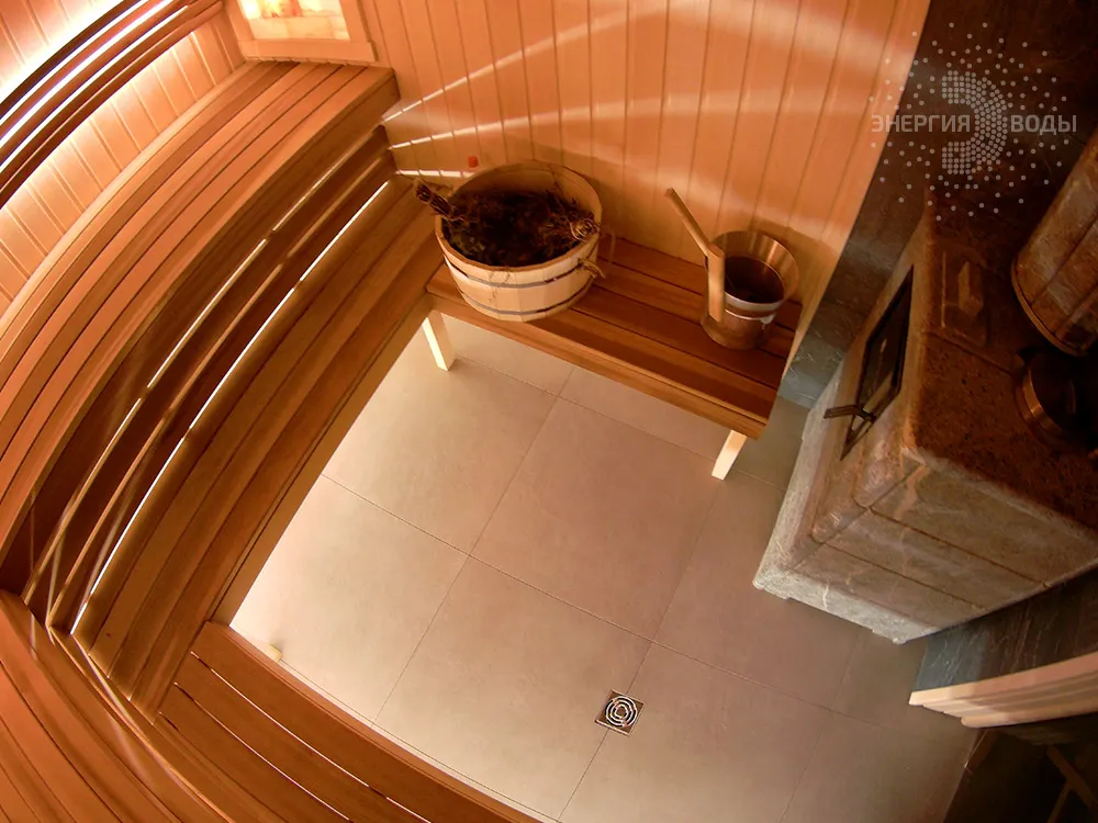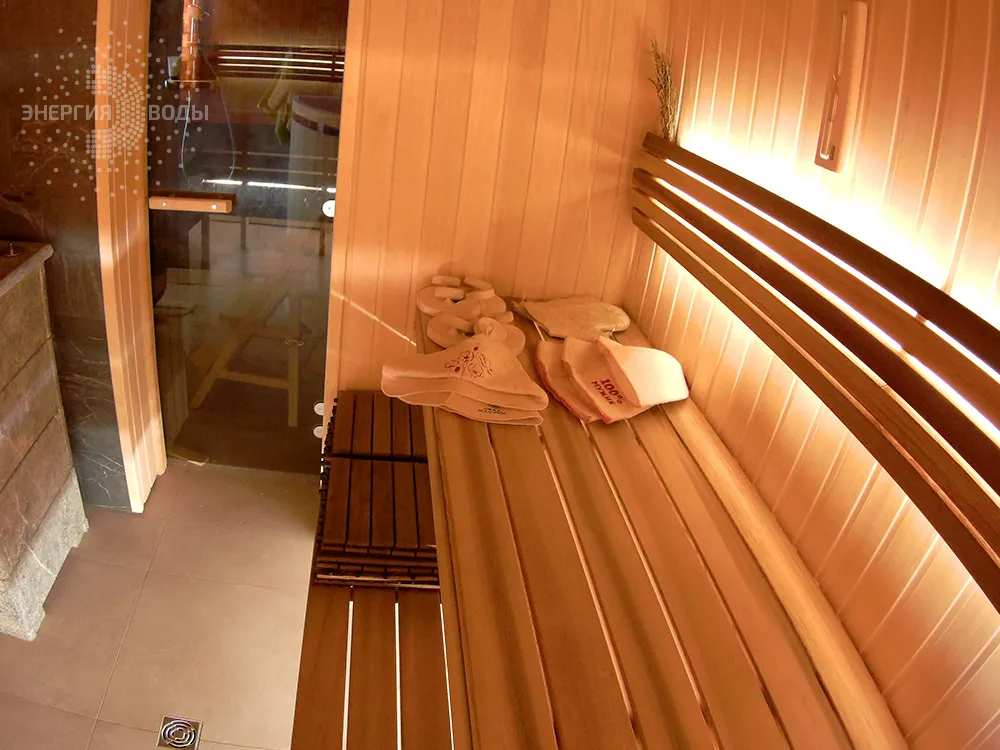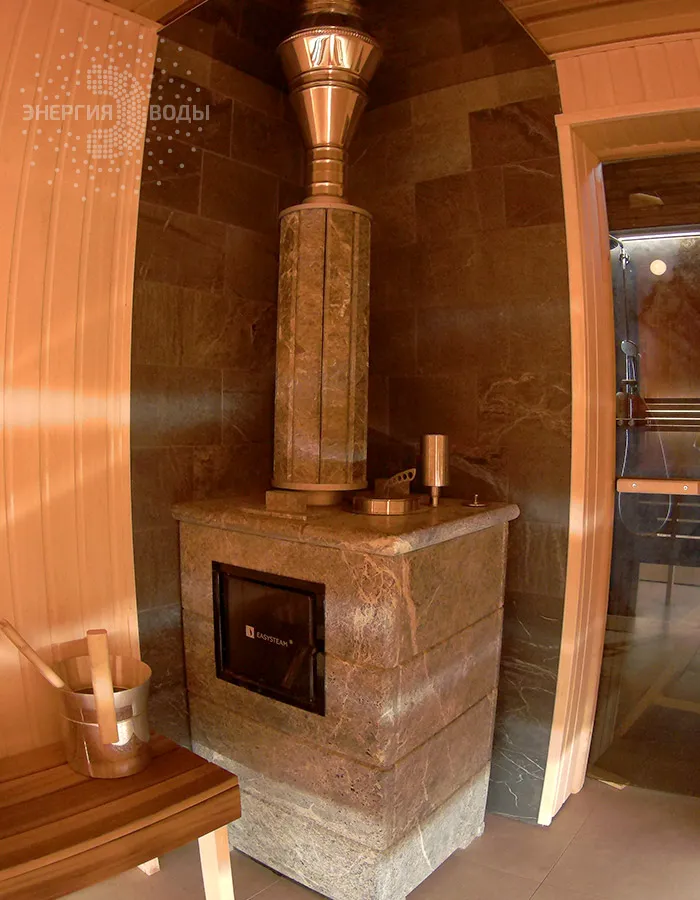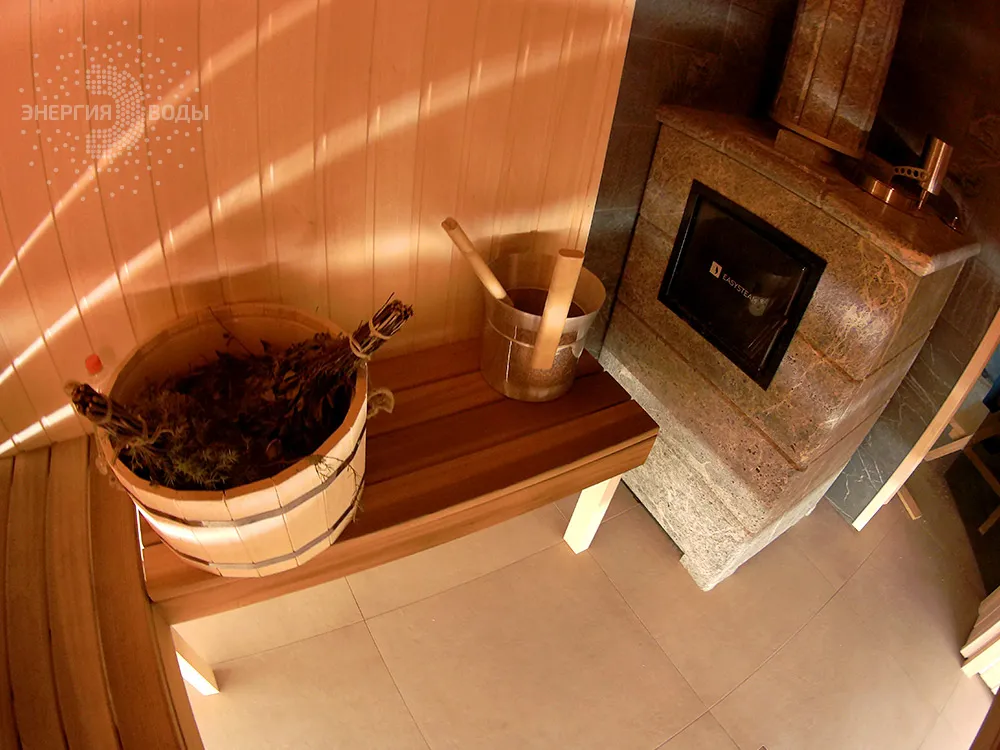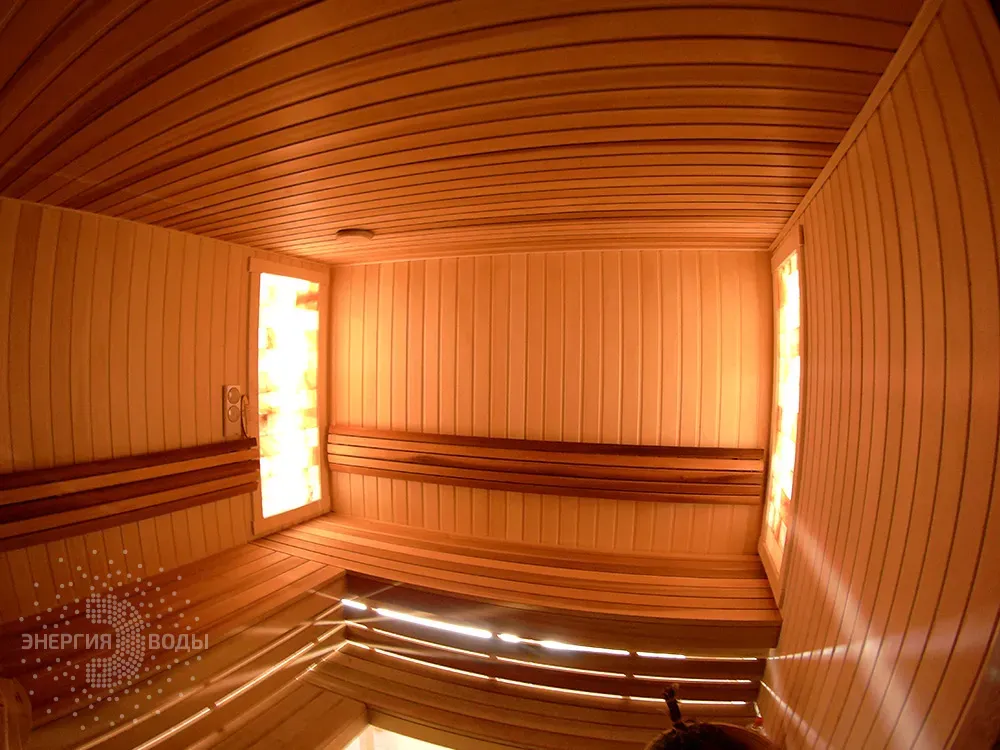 Строительство сауны в д. Вяча под ключ. Дровяная печь облицована талькохлоритом. Отделка стен за каменкой также выполнена из натурального камня. За освещение в сауне отвечает подсветка полков и два световых панно из гималайской соли.