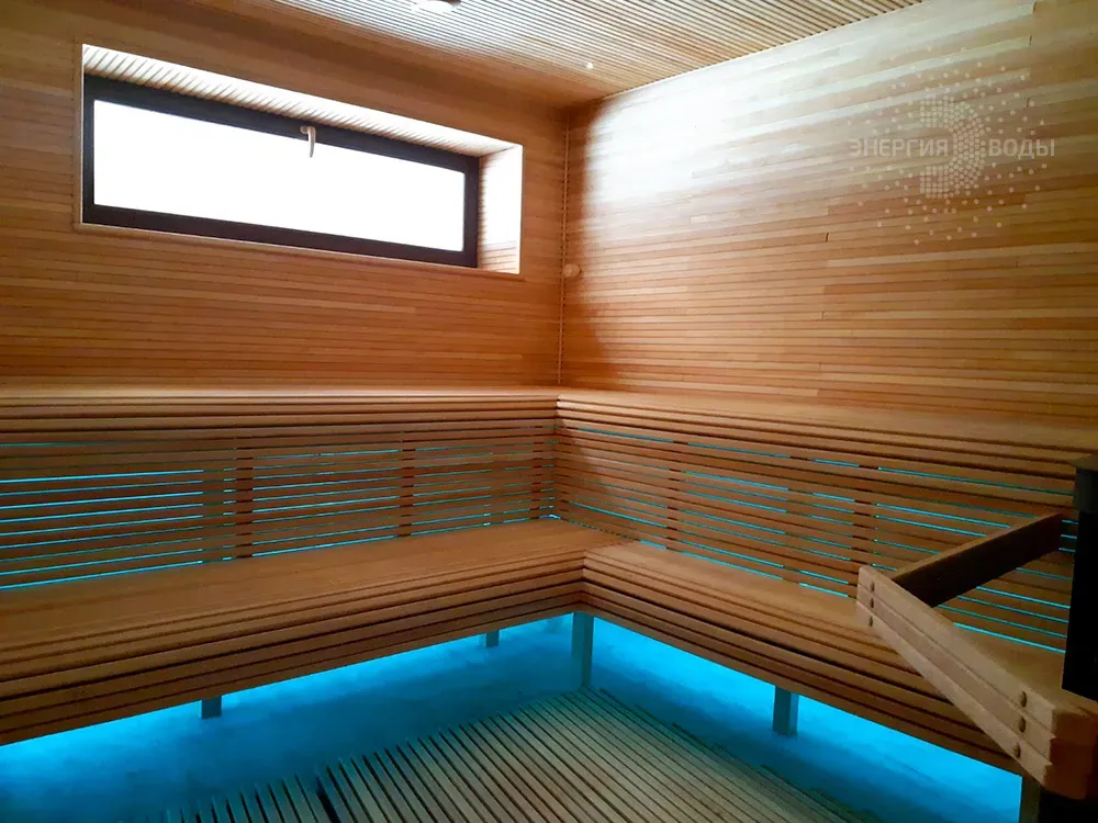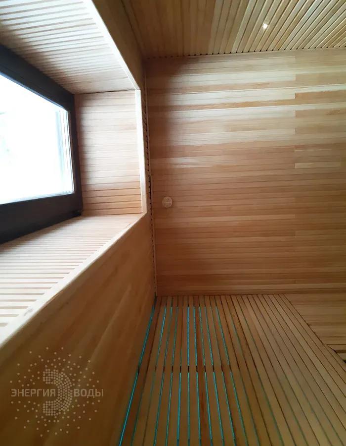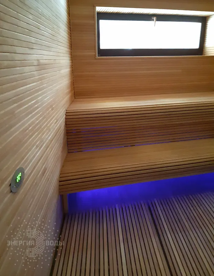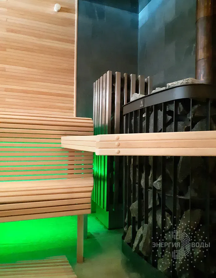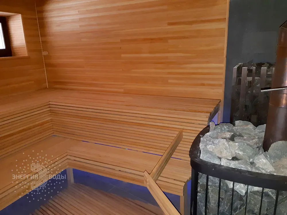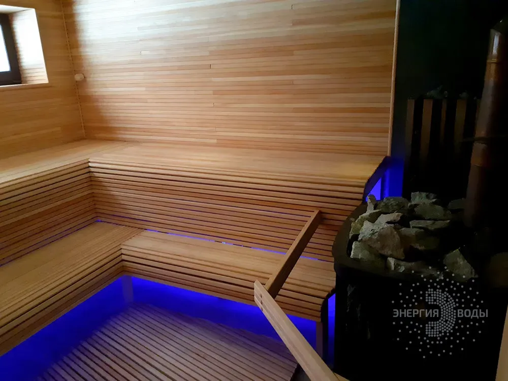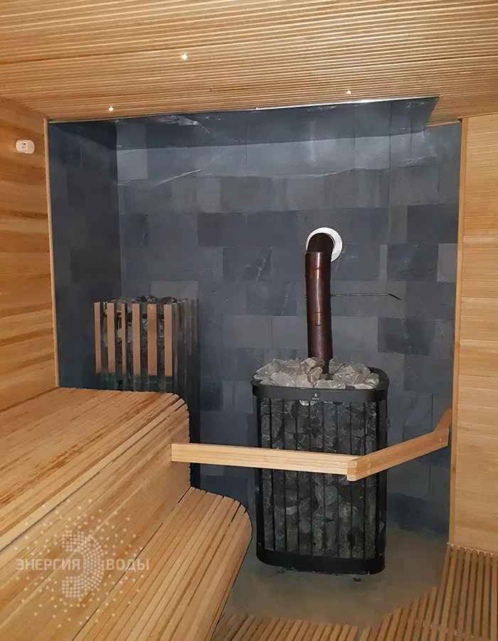 Строительство бани в Минском районе. Отделка бани выполнена из сибирского кедра. Установлены две печи: электрокаменка IKI Monolith 13,8 кВт и дровяная печь Kastor Saga 22. Стена за печами облицована натуральным камнем талькохлоритом.