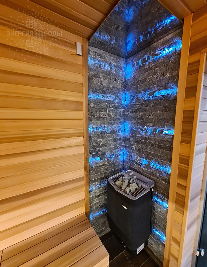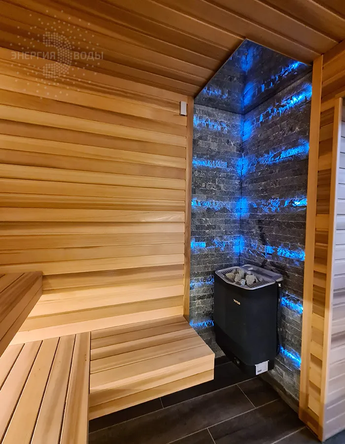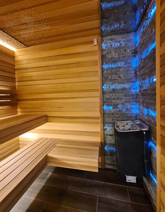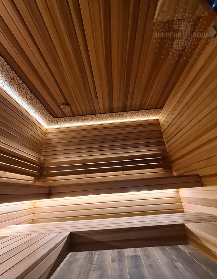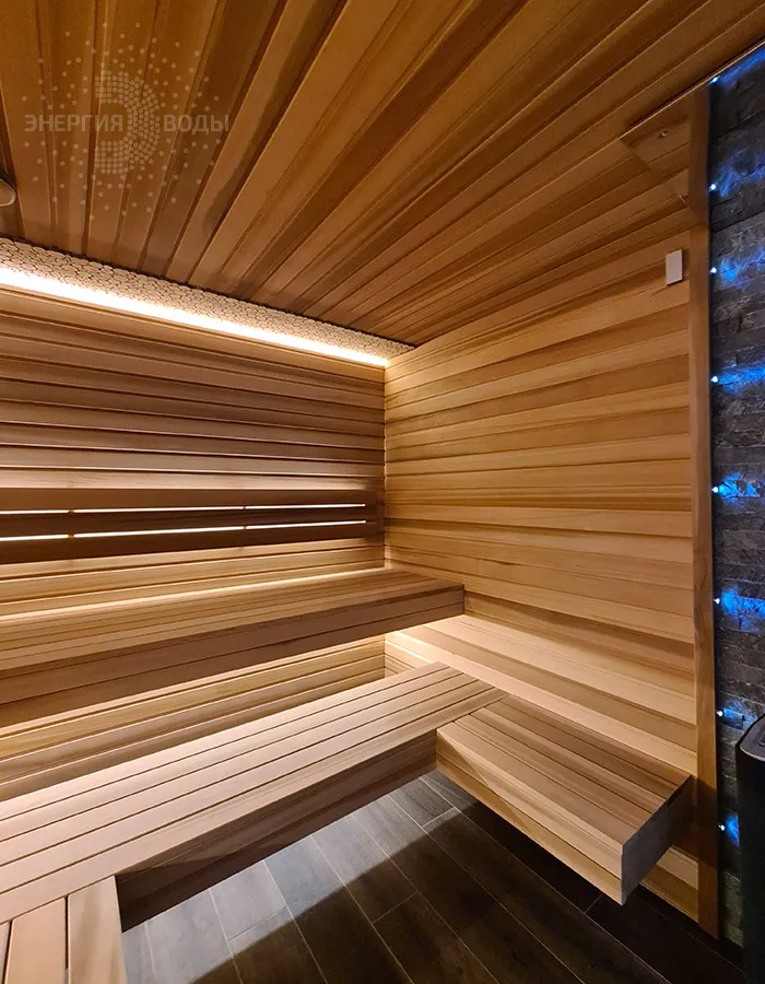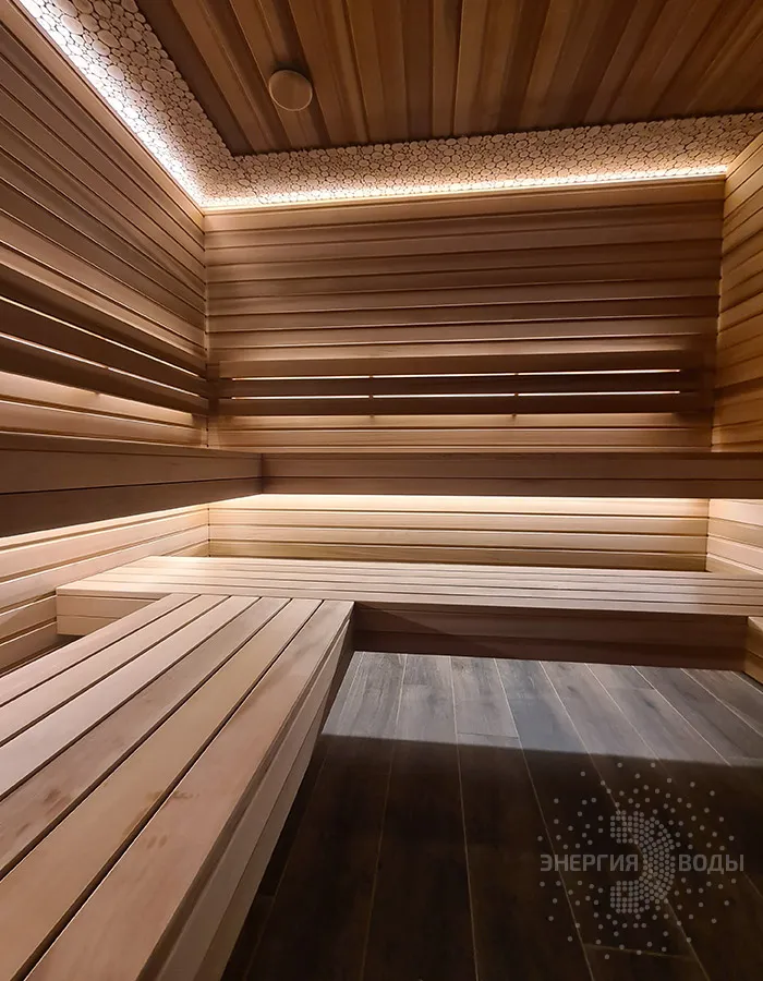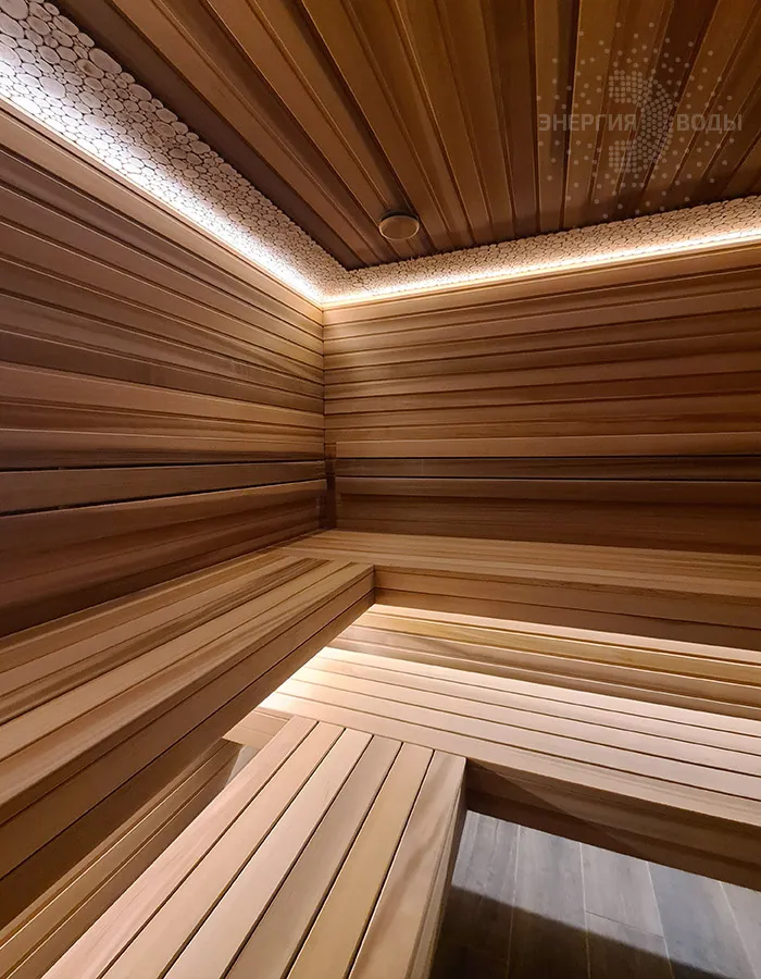 Строительство тиляриума в Ясной поляне. Тиляриум представляет собой сауну, оборудованную системой смены климатических режимов. Мягче классической сауны, способствует улучшению состояния иммунной системы и системы кровоснабжения и подходит тем, кому противопоказаны высокие температуры. Тиляриум оборудован шведской печью Tylo с парогенератором. Отделка и полки выполнены из канадского кедра. Лаконичный интерьер парной дополняет ароматное панно из можжевельника. Стена за каменкой облицована натуральным рельефным камнем, подсвеченным точечными светильниками.