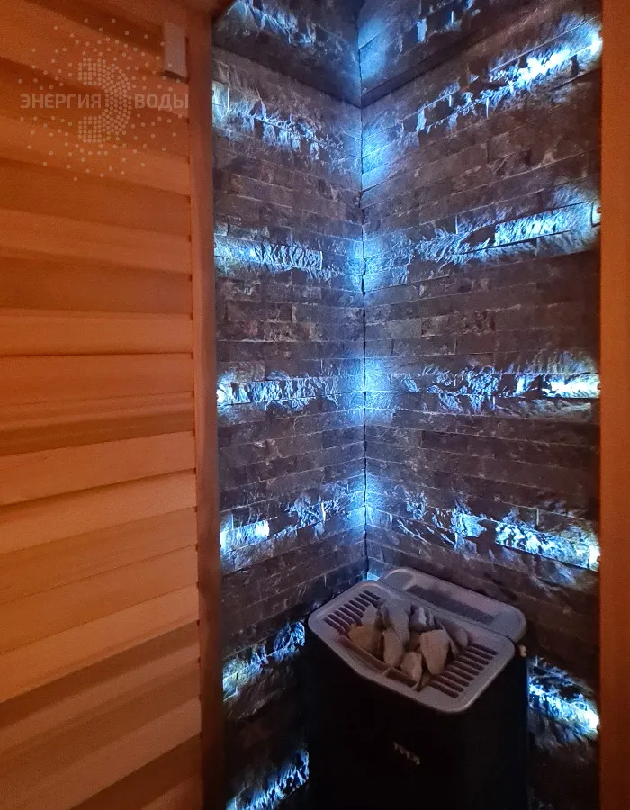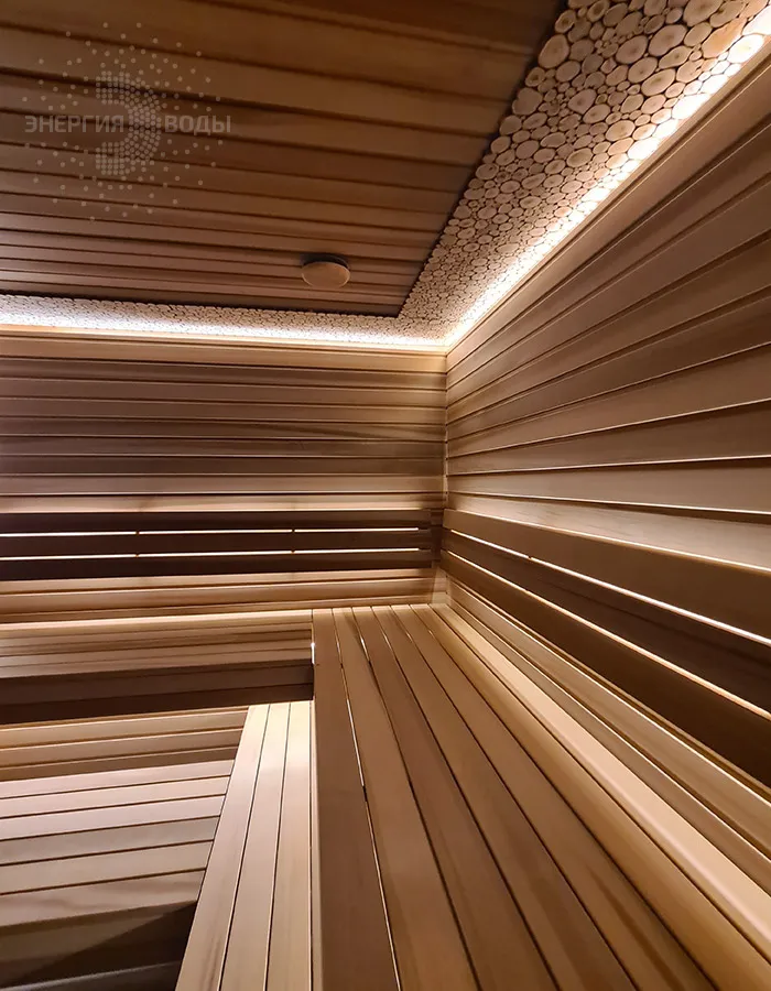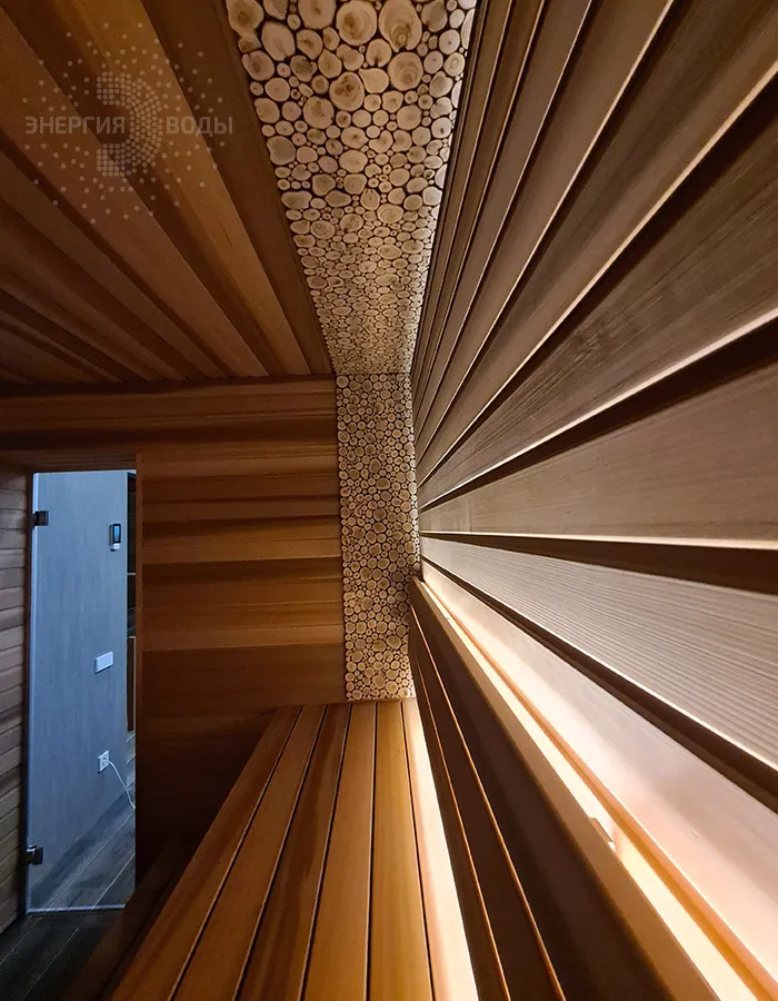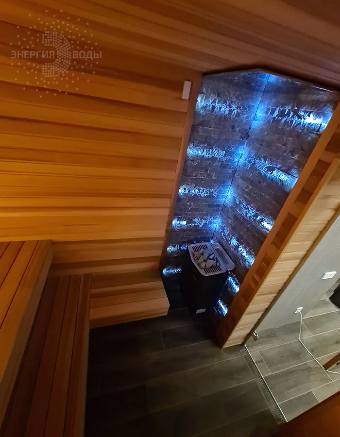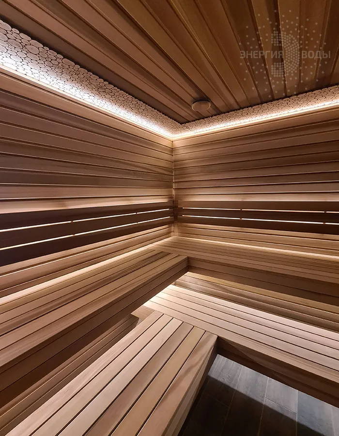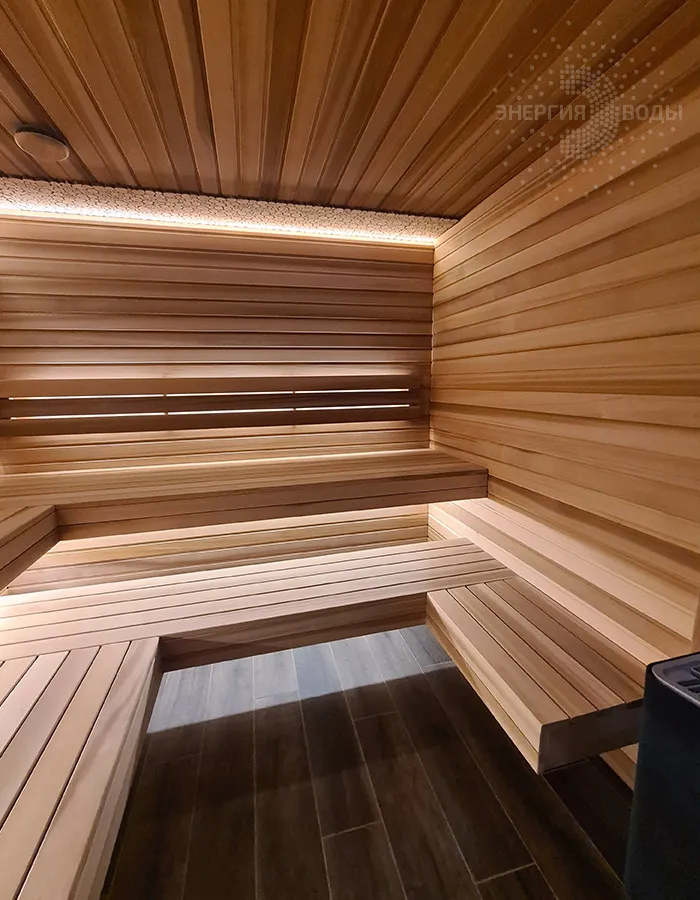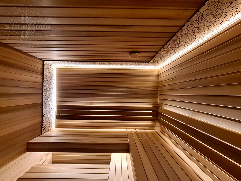 Строительство тиляриума в Ясной поляне. Тиляриум представляет собой сауну, оборудованную системой смены климатических режимов. Мягче классической сауны, способствует улучшению состояния иммунной системы и системы кровоснабжения и подходит тем, кому противопоказаны высокие температуры. Тиляриум оборудован шведской печью Tylo с парогенератором. Отделка и полки выполнены из канадского кедра. Лаконичный интерьер парной дополняет ароматное панно из можжевельника. Стена за каменкой облицована натуральным рельефным камнем, подсвеченным точечными светильниками.